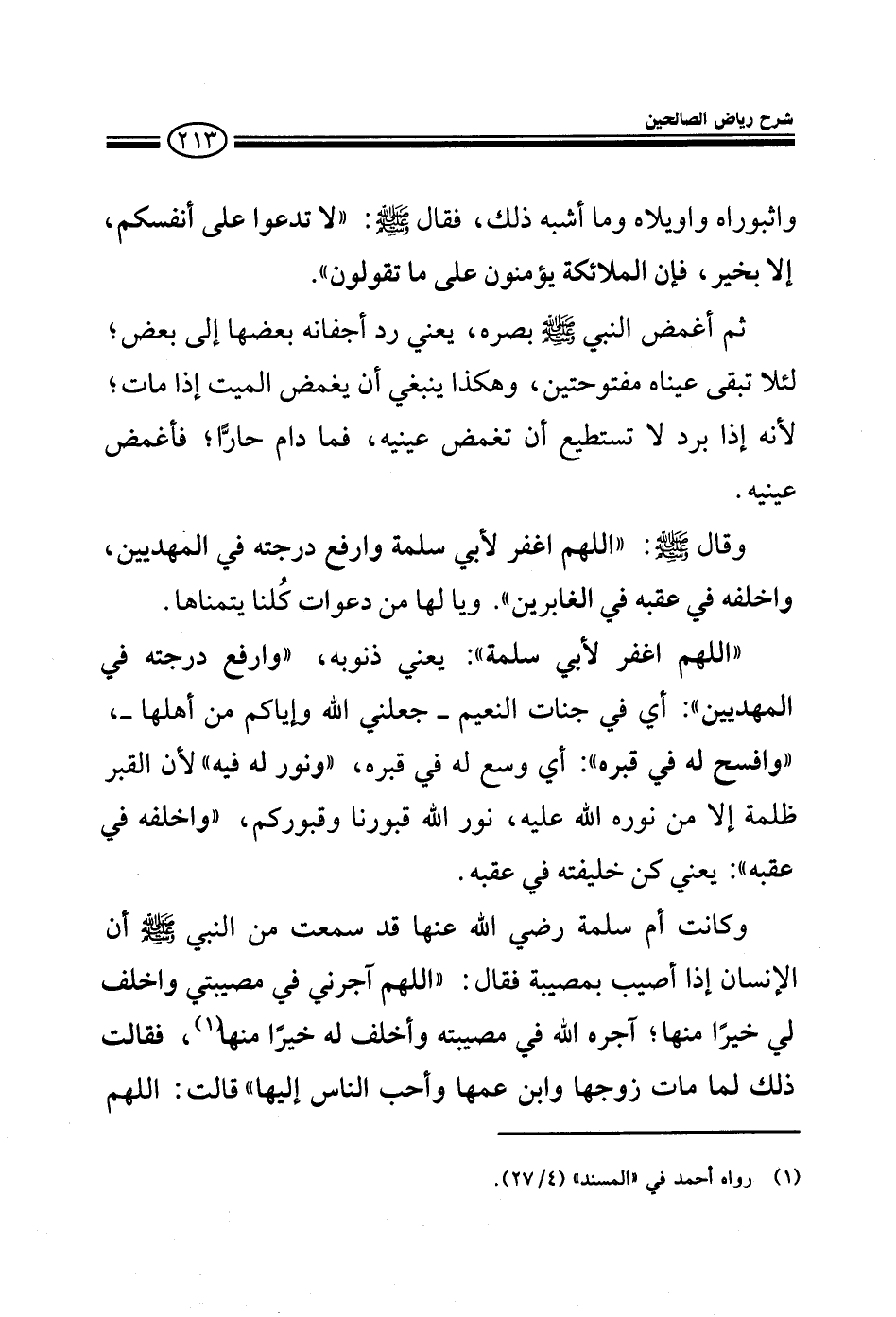 واثبوراه واويلاه وما أشبه ذلك فقال صلى الله عليه وسلم لا تدعوا علي أنفسكم إلا بخير فإن الملائكة يؤمنون علي ما تقولون ثم أغمض النبي صلى الله عليه وسلم بصره يعني رد أجفانه بعضها إلى بعض لئلا تبقى عيناه مفتوحين وهكذا ينبغي أن يغمض الميت إذا مات لأنه إذا برد ما تستطيع أن تغمض عينيه فما دام حارا فأغمض عينيه وقال صلى الله عليه وسلم: اللهم اغفر لأبي سلمة وارفع درجته في المهديين واخلفه في عقبة في الغابرين واغفر لنا وله يا رب العالمين وافسح له في قبره ونور له فيه يا لها من دعوات كلنا يتمناها اللهم اغفر لأبي سلمة يعني ذنوبه وارفع درجته في المهديين أي في جنات النعيم جعلنا الله من أهلها: وافسح له في قبره أي وسع له في قبره ونور له فيه لأن القبر ظلمة إلا من نوره الله عليه نور الله قبورنا واخلفه في عقبة يعني كن خليفته في عقبه وكانت أم سلمة رضي الله عنها قد سمعت من النبي صلى الله عليه وسلم أن الإنسان إذا أصيب بمصيبة فقال: اللهم أجرني في مصيبتي واخلف لي خيرا منها آجره الله في مصيبته وأخلف له خيرا منها فقالت ذلك لما مات زوجها وابن عمها وأحب الناس إليها