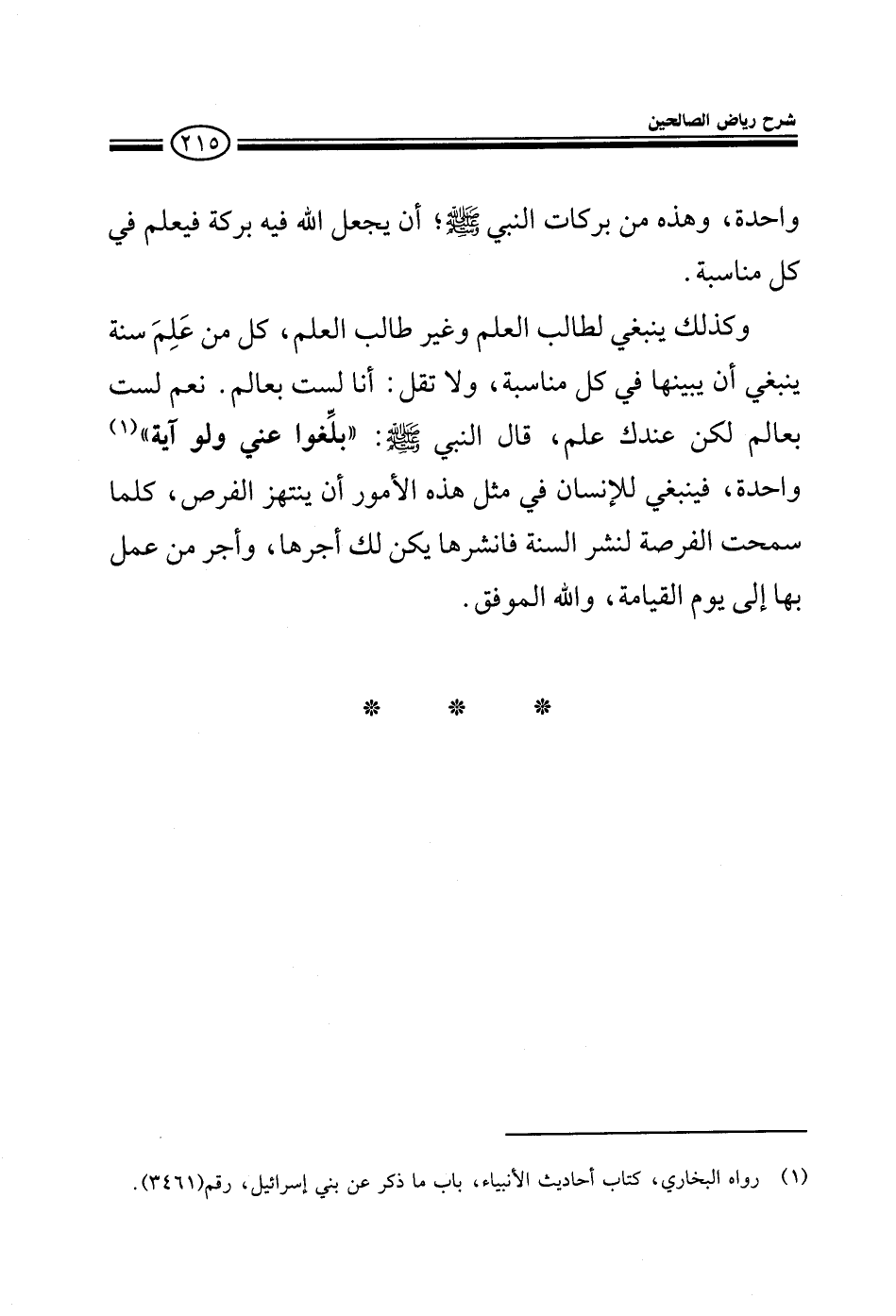 واحدة وهذه من بركات النبي صلى الله عليه وسلم أن يجعل الله فيه بركة فيعلم في كل مناسبة وكذلك ينبغي لطالب العلم وغير طالب العلم كل من علم سنة ينبغي أن يبينها في كل مناسبة ولا تقل أنا لست بعالم نعم لست بعالم لكن عندك علم قال النبي صلى الله عليه وسلم بلغوا عني ولو آية فينبغي للإنسان في مثل هذه الأمور أن ينتهز الفرص كلما سمحت الفرصة لنشر السنة فانشرها يكن لك أجرها وأجر من عمل بها إلى يوم القيامة