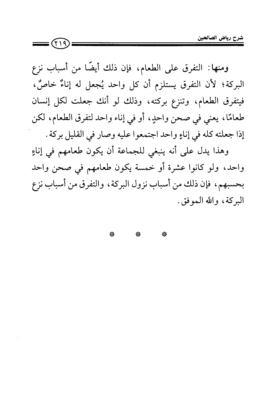 ومنها: التفرق على الطعام فإن ذلك من أسباب نزع البركة لأن التفرق يستلزم أن كل واحد يجعل له إناء خاص فيتفرق الطعام وتنزع بركته وذلك لأنك لو جعلت لكل إنسان طعاما في صحن واحد أو في إناء واحد لتفرق الطعام لكن إذا جعلته كله في إناء واحد اجتمعوا عليه وصار في القليل بركة وهذا يدل على أنه ينبغي للجماعة أن يكون طعامهم في إناء واحد ولو كانوا عشرة أو خمسة يكون طعامهم في صحن واحد بحسبهم فإن ذلك من أسباب نزول البركة والتفرق من أسباب نزع البركة