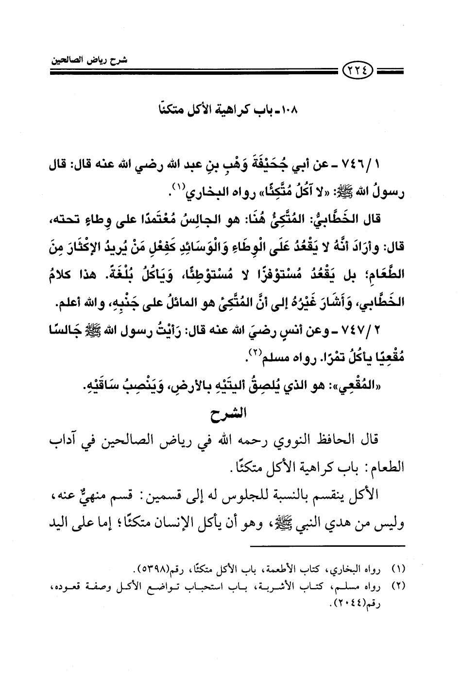 746 - عن أبي جحيفة وهب بن عبد الله رضي الله عنه قال: قال رسول الله صلى الله عليه وسلم: لا آكل متكئا رواه البخاري قال الخطابي: المتكيء هنا هو الجالس معتمدا على وطاء تحته قال وأراد أنه لا يقعد على الوطاء والوسائد كفعل من يريد الإكثار من الطعام بل يقعد مستوفزا لا مستوطئا ويأكل بلغة هذا كلام الخطابي وأشار غيره إلى أن المتكئ هو المائل على جنبه والله أعلم