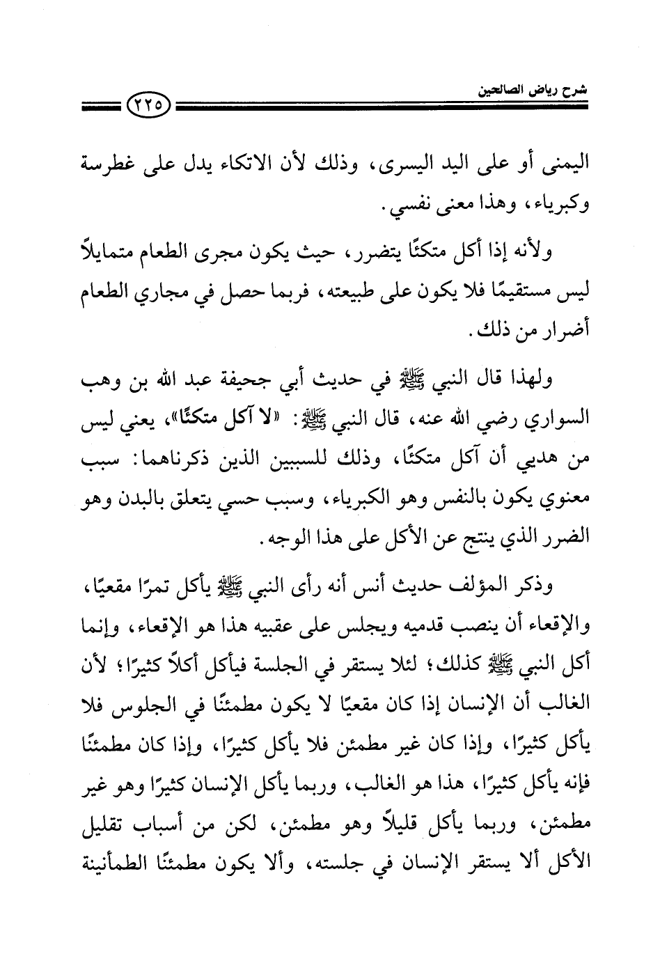 اليمنى أو على اليد اليسرى وذلك لأن الاتكاء يدل على غطرسة وكبرياء وهذا معنى نفسي ولأنه إذا أكل متكئا يتضرر حيث يكون مجرى الطعام متمايلا ليس مستقيما فلا يكون على طبيعته فربما حصل في مجارى الطعام أضرار من ذلك ولهذا قال النبي صلى الله عليه وسلم في حديث أبي جحيفة عبد الله بن وهب السواري رضي الله عنه قال النبي صلى الله عليه وسلم: لا آكل متكئا ويعني ليس من هديي أن آكل متكئا وذلك للسببين اللذين ذكرناهما: سبب معنوي يكون بالنفس وهو الكبرياء وسبب حسى يتعلق بالبدن وهو الضرر الذي ينتج عن الأكل على هذا الوجه وذكر المؤلف حديث أنس أنه رأى النبي صلى الله عليه وسلم يأكل تمرا مقعيا والإقعاء أن ينصب قدميه ويجلس على عقبيه هذا هو الإقعاء وإنما أكل النبي صلى الله عليه وسلم كذلك لئلا يستقر في الجلسة فيأكل أكلا كثيرا لأن الغالب أن الإنسان إذ كان مقعيا لا يكون مطمئنا في الجلوس فلا يأكل كثيرا وإذا كان غير مطمئن فلن يأكل كثيرا وإذا كان مطمئنا فإنه يأكل كثيرا هذا هو الغالب وربما يأكل الإنسان كثيرا وهو غير مطمئن وربما يأكل قليلا وهو مطمئن لكن من أسباب تقليل الأكل ألا يستقر الإنسان في جلسته وألا يكون مطمئنا الطمأنينة
