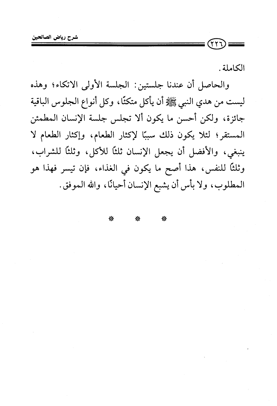 الكاملة والحاصل أن عندنا جلستين: الجلسة الأولى الاتكاء، وهذه ليس من هدي النبي صلى الله عليه وسلم أن يأكل متكئا وكل أنواع الجلوس الباقية جائزة ولكن أحسن ما يكون ألا تجلس جلسة الإنسان المطمئن المستقر لئلا يكون ذلك سببا لإكثار الطعام وإكثار الطعام لا ينبغي والأفضل أن يجعل الإنسان ثلثا للأكل وثلثا للشراب وثلثا للنفس هذا أصح ما يكون في الغذاء فإن تيسر فهذا هو المطلوب ولا بأس أن يشبع الإنسان أحيانا