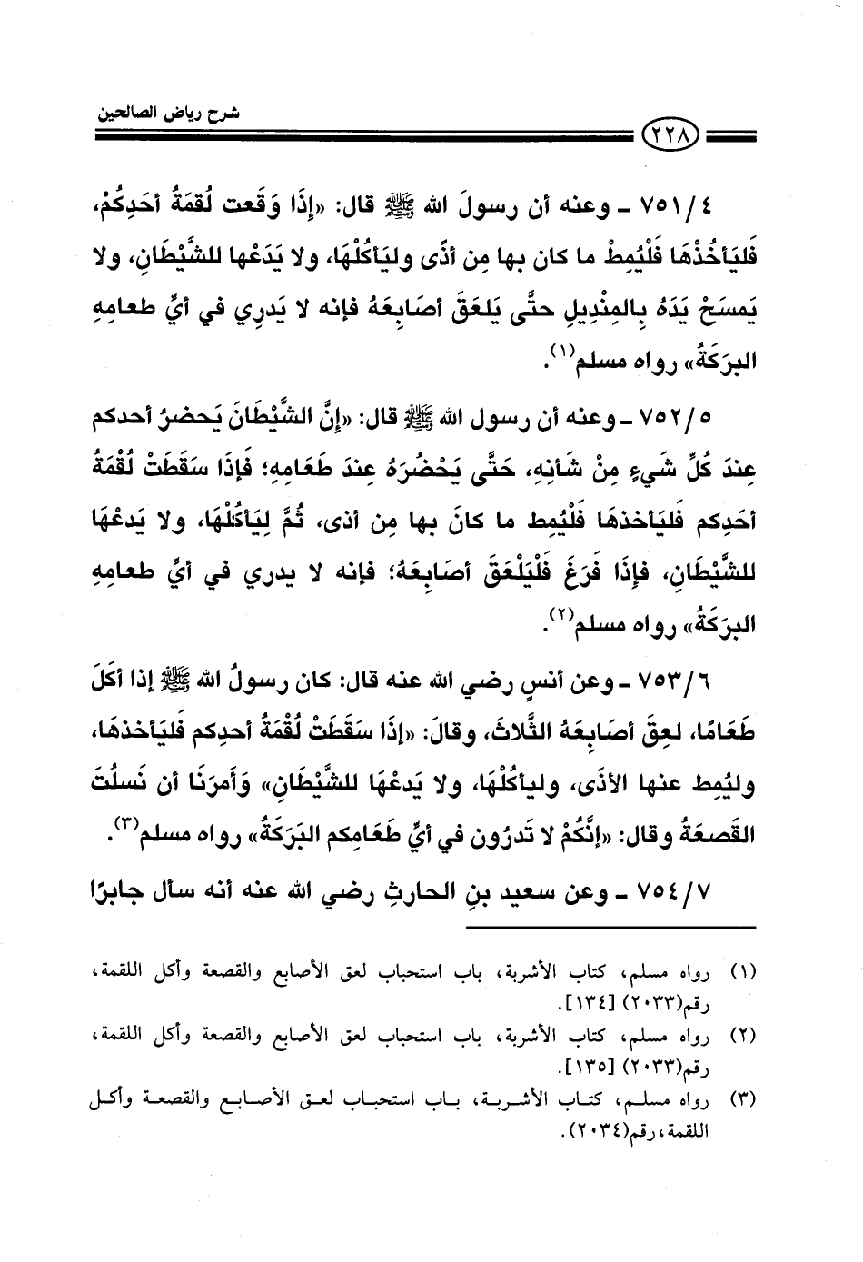 753 - وعن أنس رضي الله عنه قال: كان رسول الله صلى الله عليه وسلم إذا أكل طعاما لعق أصابعه الثلاث وقال: إذا سقطت لقمة أحدكم فليأخذها وليمط عنها الأذى وليأكلها ولا بدعها للشيطان وأمرنا أن نسلت القصعة وقال: إنكم لا تدرون في أي طعامكم البركة رواه مسلم