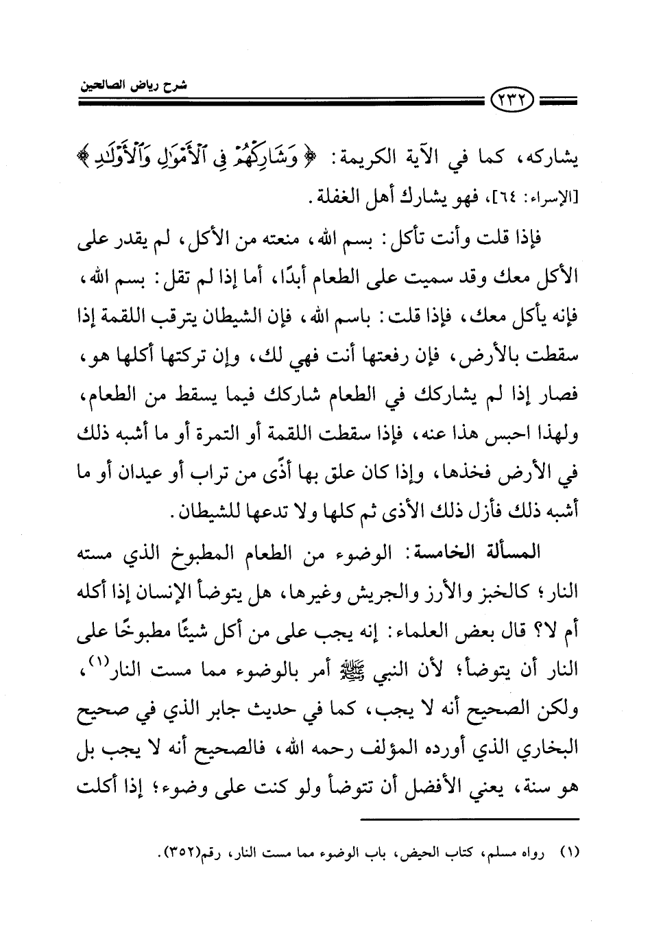 يشاركه كما في الآية الكريمة وشاركهم في الأموال والأولاد فهو يشارك أهل الغفلة فإذا قلت وأنت تأكل: بسم الله منعته من الأكل، ما يقدر على الكل معك وقد سميت على الطعام أبدا إذا لم تقل بسم الله أكل معك فإذا قلت: الله بسم فإن الشيطان يترقب اللقمة إذا سقطت بالأرض فإن رفعتها أنت فهي لك وإن تركتها أكلها هو فصار إذا لم يشاركك في الطعام شاركك فيما يسقط من الطعام ولهذا فضيق عليه في ذلك أيضا فإذا سقطت اللقمة أو التمرة أو ما أشبه ذلك في الأرض فخذها وإذا كان علق بها أذى من تراب أو عيدان أو ما أشبه ذلك فأزل ذلك الأذى ثم كلها ولا تدعها للشيطان المسألة الخامسة: الوضوء من الطعام المطبوخ الذي مسته النار كالخبز والأرز والجريش وغيرها هل يتوضأ الإنسان إذا أكله أم لا؟ قال بعض العلماء إنه يجب على من أكل شيئا مطبوخا على النار أن يتوضأ لأن النبي صلى الله عليه وسلم أمر بالضوء مما مست النار ولكن الصحيح أنه لا يجب كما في حديث جابر في صحيح البخاري الذي أورده المؤلف رحمه الله فالصحيح أنه لا يجب بل هو سنة يعني الأفضل أن يتوضأ حتى ولو كنت على وضوء إذا أكلت