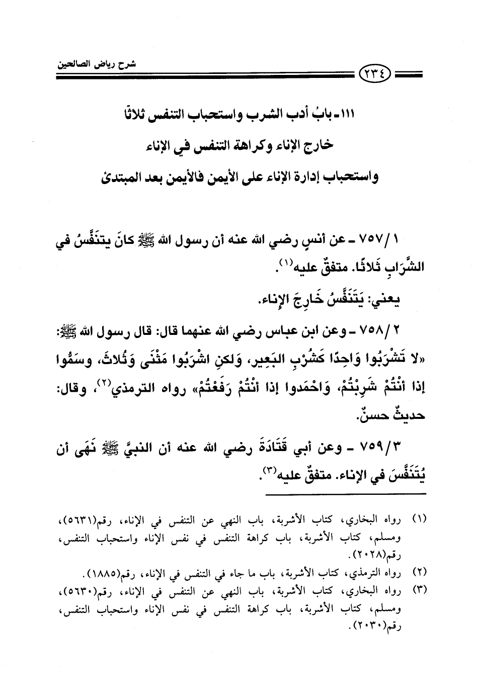 757 - عن أنس رضي الله عنه أن رسول الله صلى الله عليه وسلم كان يتنفس في الشراب ثلاثا متفق عليه يعني يتنفس خارج الإناء