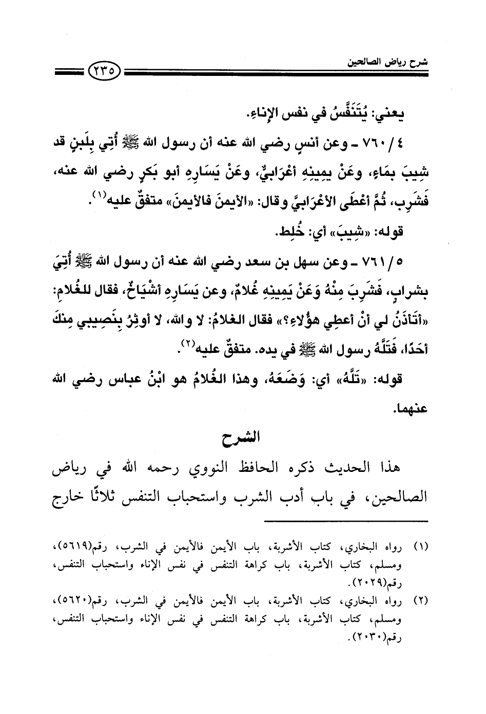 761 - وعن سهل بن سعد رضي الله عنه أن رسول الله صلى الله عليه وسلم أتى بشراب فشرب منه وعن يمينه غلام وعن يساره أشياخ فقال للغلام أتأذن لي أن أعطى هؤلاء فقال الغلام لا والله لا أوثر بنصيبي منك أحدا فتله رسول الله صلى الله عليه وسلم في يده متفق عليه قوله: تله أي: وضعه وهذا الغلام هو ابن عباس رضي الله عنهما