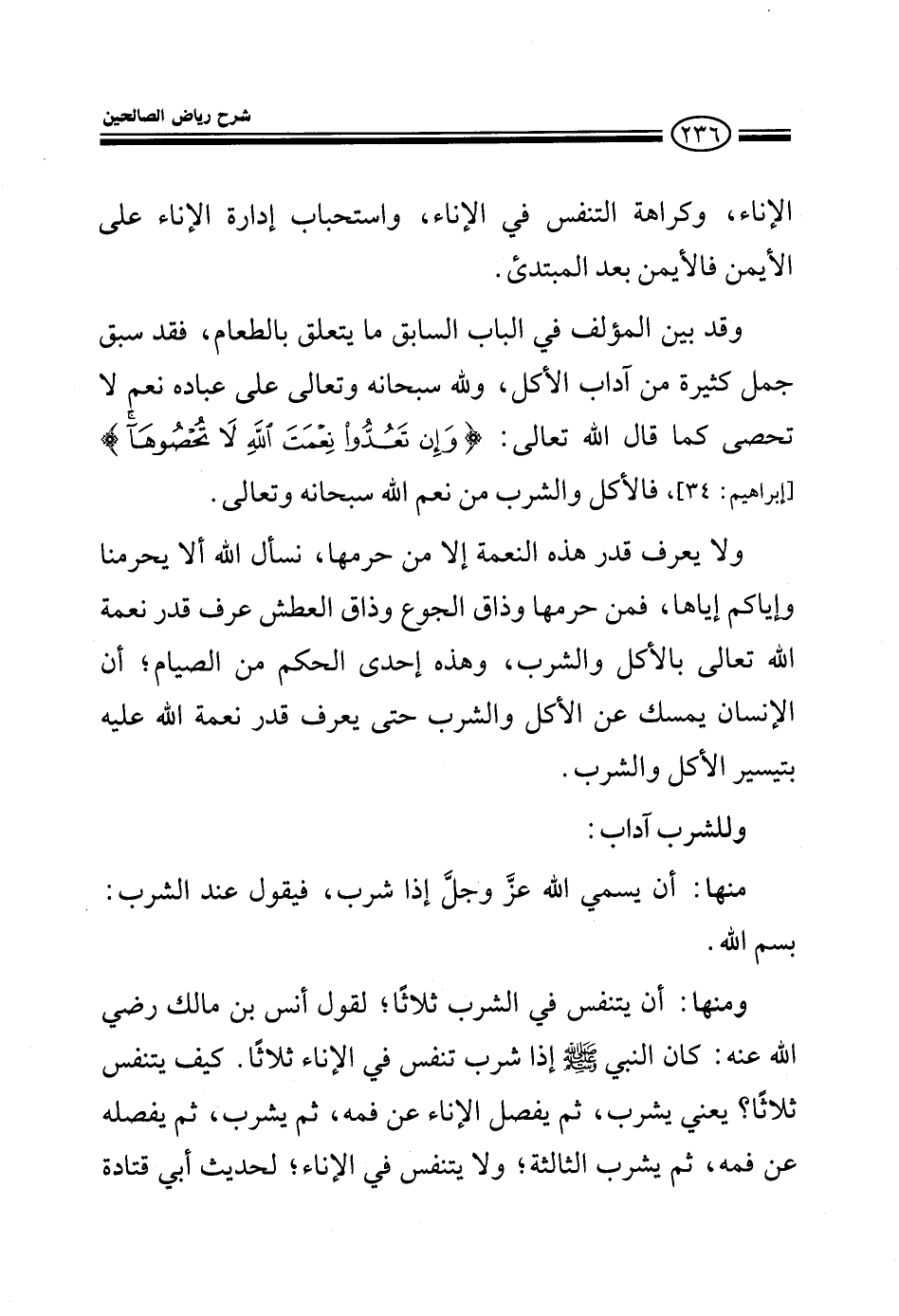 الإناء وكراهة التنفس في الإناء واستحباب إدارة الإناء على الأيمن فالأيمن بعد المبتدئ) وقد بين المؤلف في الباب السابق ما يتعلق بالطعام فقد سبق جمل كثيرة من آداب الأكل ولله سبحانه وتعالى على عباده نعم لا تحصى كما قال الله تعالى: وَإِن تَعُدُّوا نِعْمَتَ اللهِ لاَ تُحْصُوهَا فالأكل والشرب من نعم الله سبحانه وتعالى: ولا يعرف قدر هذه النعمة إلا من حرمها نسأل الله ألا يحرمنا إياها فمن حرمها وذاق الجوع وذاق العطش عرف نعمة الله تعالى بالأكل والشرب وهذه إحدى الحكم من الصيام أن الإنسان يمسك عن الأكل والشرب حتى يعرف قدر نعمة الله عليه بتيسير الأكل والشرب وللشرب آداب منها أن يسمى الله عز وجل إذا شرب فيقول عند الشرب: بسم الله ومنها أن يتنفس في الشرب ثلاثا لقول أنس بن مالك رضى الله عنه كان النبي صلى الله عليه وسلم إذا شرب تنفس في الشراب ثلاثا كيف يتنفس في الشراب ثلاثا؟ يعني يشرب ثم يفصل الإناء عن فمه ثم يشرب الثالثة ولا يتنفس في الإناء لحديث أبي قتادة
