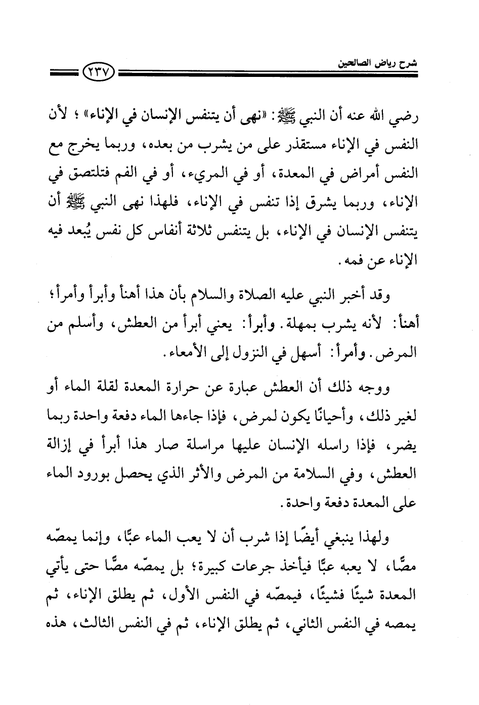 رضى الله عنه أن النبي صلى الله عليه وسلم: نهى أن يتنفس الإنسان في الإناء والحكمة من ذلك أن النفس في الإناء مستقذر على من يشرب من بعده وربما تخرج من النفس أمراض في المعدة أو في المريء أو في الفم فتلتصق بالإناء وربما يشرق إذا تنفس في الإناء فلهذا نهي النبي صلى الله عليه وسلم أن يتنفس الإنسان في الإناء بل يتنفس ثلاثة أنفاس كل نفس يبعد فيه الإناء عن فمه وقد أخبر النبي عليه الصلاة والسلام بأن هذا أهنأ وأبرأ وأمرأ أهنأ لأنه يشرب بمهلة وأبرأ: يعني أبرأ من العطش، وأسلم من المرض.