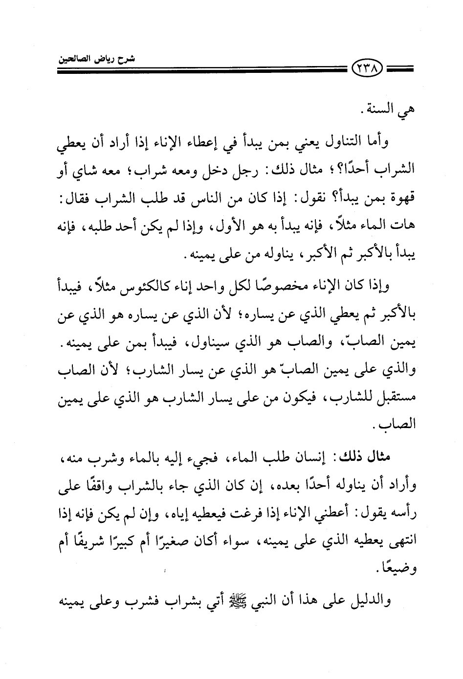 هي السنة وأما التناول يعني بمن يبدأ في إعطاء الإناء إذا أراد أن يعطي الشراب أحدا؟ مثال ذلك: رجل دخل ومعه شراب شاي أو قهوة بمن يبدأ نقول: إذا كان أحد من الناس قد طلب الشراب فقال هات الماء مثلا فإنه يبدأ به هو الأول وإذا لم يكن أحد طلبه فإنه يبدأ بالأكبر ثم الأكبر يناوله من على يمينه وإذا كان لكل واحد إناء كالكئوس مثلا فليبدأ بالأكبر ثم يعطي الذي عن يساره لأن الذي عن يساره هو الذي عن يمين الصاب والصاب هو الذي سيناول فيبدأ بمن على يمينه والذي على يمين الصاب هو الذي على يسار الشارب لأن الصاب مستقبل للشارب فيكون من على يسار الشارب هو الذي على يمين الصاب مثال ذلك مثلا: إنسان طلب الماء فجيء إليه بالماء فشرب منه وأراد أن يناوله أحدا بعده إن كان الذي جاء بالشراب واقفا على رأسه يقول: أعطني الإناء إذا فرغت فيعطيه إياه وإن لم يكن فإنه إذا انتهى يعطيه للذي على يمينه سواء كان صغيرا أو كبيرا شريفا أو وضيعا والدليل على هذا أن النبي صلى الله عليه وسلم أتى بلبن قد شيب بماء فشرب وعلى يمينه