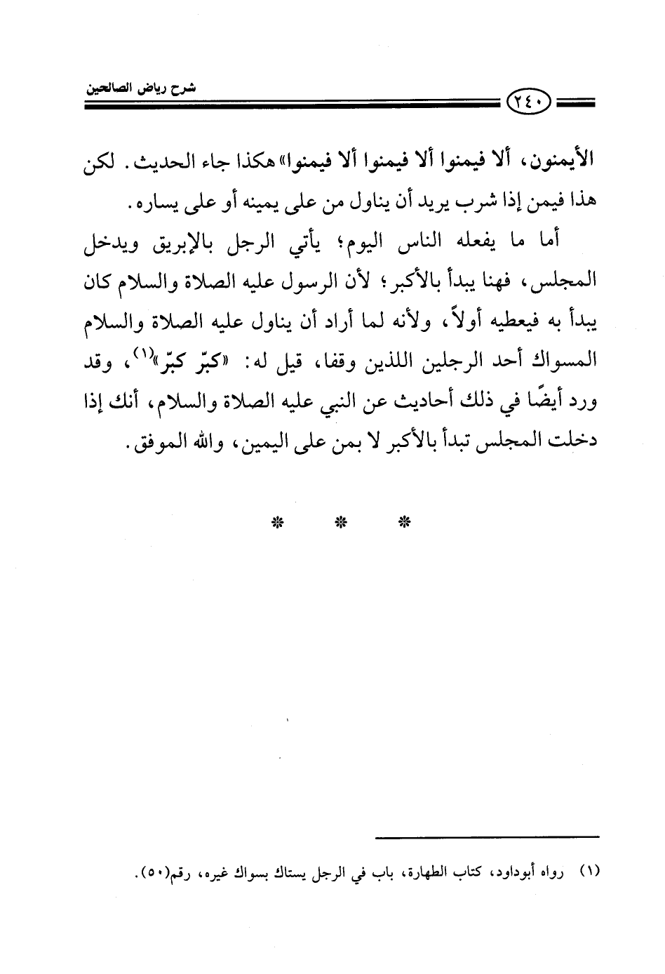 الأيمنون ألا فيمنوا ألا فيمنوا ألا فيمنوا هكذا جاء الحديث لكن هذا فمن إذا شرب يريد أن يناول من على يمينه أو على يساره أما ما يفعله الناس اليوم يأتي الرجل بالإبريق ويدخل المجلس فهنا يبدأ بالأكبر لأن الرسول عليه الصلاة والسلام كانوا يبدءون به فيعطونه أولا ولأنه لما أراد أن يناول عليه الصلاة والسلام المسواك أحد الرجلين اللذين وقفا قيل له: كبر كبر وقد ورد في ذلك أيضا أحاديث عن النبي عليه الصلاة والسلام أنك إذا دخلت المجلس تبدأ بالأكبر لا بمن على يمين