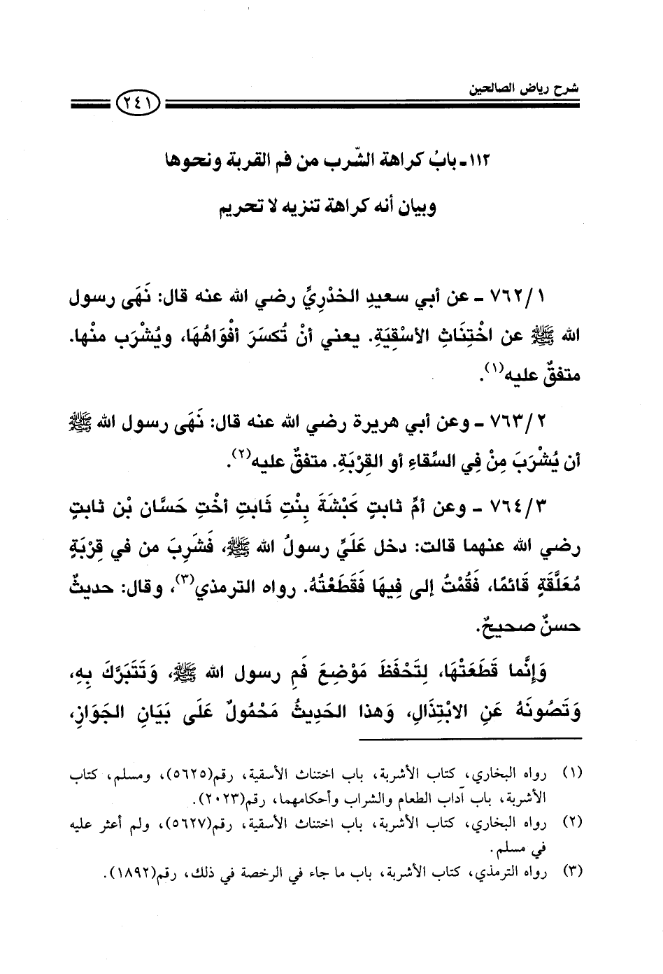 764 - وعن أم ثابت كبشة بنت ثابت أخت حسان بن ثابت رضى الله عنه وعنها قالت: دخل علي رسول الله صلى الله عليه وسلم فشرب في قربة معلقة قائما فقمت إلى فيها فقطعته رواه الترمذي وقال: حديث حسن صحيح وإنما قطعتها لتحفظ موضع فم رسول الله صلى الله عليه وسلم وتتبرك به وتصونه عن الابتذال وهذا الحديث محمول على بيان الجواز