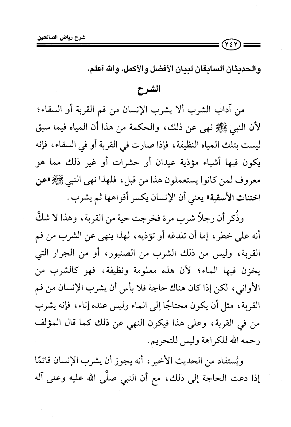 EXقال المؤلف رحمه الله تعالى: (باب كراهة الشرب من فم القربة ونحوها وبيان أنه كراهة تنزيه لا تحريم) من آداب الشرب ألا يشرب الإنسان من فم القربة أو السقاء لأن النبي صلى الله عليه وسلم نهى عن ذلك والحكمة من هذا أن المياه فيما سبق ليست بتلك المياه النظيفة فإذا صارت في القربة أو في السقاء فإنه يكون فيها أشياء مؤذية عيدان أو حشرات أو غير ذلك مما هو معروف لمن كانوا يستعملون هذا من قبل فلهذا نهى النبي صلى الله عليه وسلم: عن اختناث الأسقية يعني أن الإنسان يكسر أفواهها هكذا ثم شرب وذكر أن رجلا شرب مرة هكذا فخرجت حية من القربة وهذا لاشك أنه على خطر إما أن تلدغه أو تؤذيه لهذا ينهي عن الشرب من فم القربة وليس من ذلك الشرب من الصنبور أو من الجرار التي يخزن فيها الماء لأن هذه معلومة ونظيفة فهو كالشرب من الأواني لكن إذا كان هناك حاجة فلا بأس أن يشرب الإنسان من فم القربة مثل أن يكون محتاجا إلى الماء وليس عنده إناء فإنه يشرب من في القربة وعلى هذا فيكون النهي عن ذلك كما قال المؤلف رحمه الله للكراهة وليس للتحريم ويستفاد من الحديث الأخير: أنه يجوز أن يشرب الإنسان قائما إذا دعت الحاجة إلى ذلك مع أن النبي صلى الله عليه وسلم وعلي آله