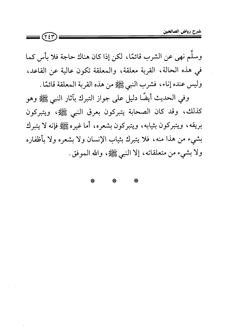 وسلم نهي عن الشرب قائما لكن إذا كان هناك حاجة فلا بأس كما في هذه الحالة القربة معلقة والمعلقة تكون عالية عن القاعد وليس عنده إناء فشرب النبي صلى الله عليه وسلم من هذه القربة المعلقة قائما وفي الحديث أيضا: دليل على جواز التبرك بآثار النبي صلى الله عليه وسلم وهو كذلك وقد كان الصحابة يتبركون بعرق النبي صلى الله عليه وسلم ويتبركون بريقه ويتبركون بثيابه ويتبركون بشعره أما غيره صلى الله عليه وسلم فإنه لا يتبرك بشيء من هذا منه فلا يتبرك بثياب الإنسان ولا بشعره ولا بأظفاره ولا بشيء من متعلقاته إلا النبي صلى الله عليه وعلى أله وسلم