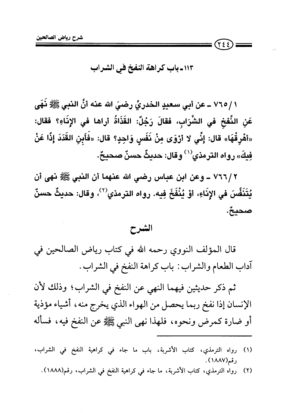 766 - وعن ابن عباس رضى الله عنهما أن النبي صلى الله عليه وسلم نهى أن يتنفس في الإناء أو ينفخ فيه رواه الترمذي وقال: حديث حسن صحيح