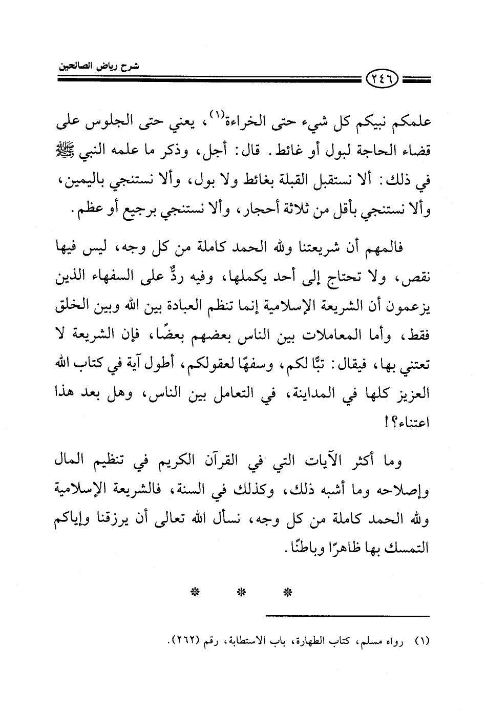 علمكم نبيكم كل شيء حتى الخراءة يعني حتى الجلوس على قضاء الحاجة لبول أو غائط قال: أجل وذكر ما علمه النبي صلى الله عليه وسلم في ذلك ألا نستقبل القبلة بغائط ولا بول، وألا نستنجي باليمين، وألا نستنجي بأقل من ثلاثة أحجار، وألا نستنجي برجيع أو عظم فالمهم أن شريعتنا ولله الحمد كاملة من كل وجه، ليس فيها نقص ولا تحتاج إلى أحد يكملها وفيه رد على السفهاء الذين يزعمون أن الشريعة الإسلامية إنما تنظم العبادة بين الله وبين الخلق فقط وأما المعاملات بين الناس بعضهم بعضا فإن الشريعة لا تعتني بها فيقال لهؤلاء تبا لكم وسفها لعقولكم أطول آية في كتاب الله العزيز كلها في المداينة في التعامل بين الناس وهل بعد هذا من اعتناء وما أكثر الآيات في القرآن الكريم في تنظيم المال وإصلاحه وما أشبه ذلك وكذلك في السنة فالشريعة الإسلامية ولله الحمد كاملة من كل وجه