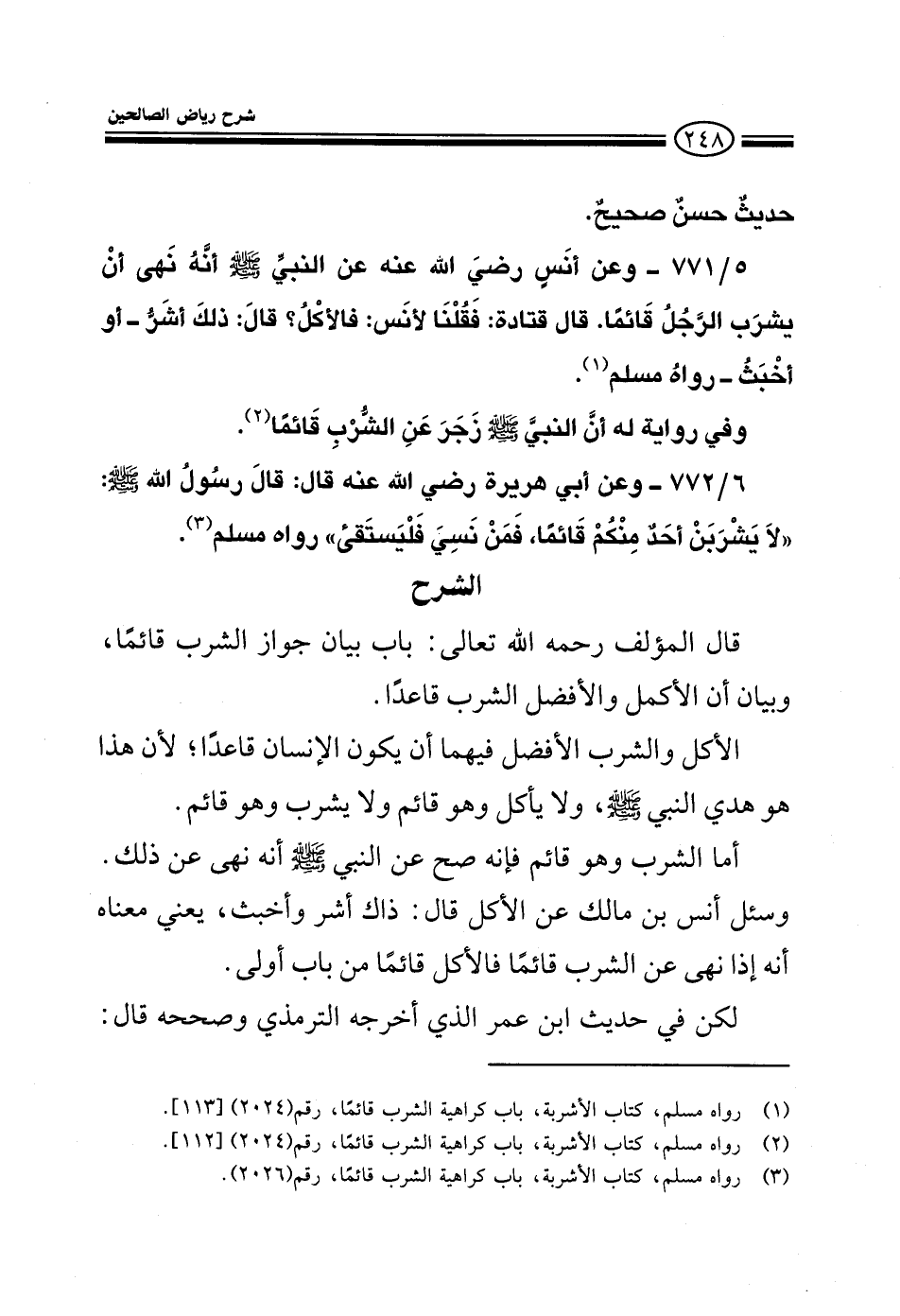 771 - وعن أنس رضى الله عنه عن النبي صلى الله عليه وسلم أنه نهى أن يشرب الرجل قائما قال قتادة: فقلنا لأنس: فالأكل؟ قال: ذلك أشر أو أخبث رواه مسلم وفي رواية له أن النبي صلى الله عليه وسلم زجر عن الشرب قائما