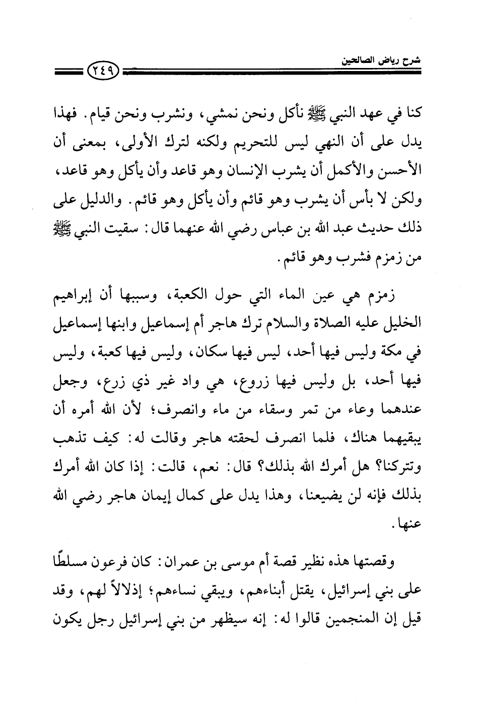 كنا في عهد النبي صلى الله عليه وسلم نأكل ونحن نمشي ونشرب ونحن قيام فهذا يدل على أن النهي ليس للتحريم ولكنه لترك الأولى بمعنى أن الأحسن والأكمل أن يشرب الإنسان وهو قاعد وأن يأكل وهو قاعد ولمكن لا بأس أن يشرب وهو قائم وأن يأكل وهو قائم والدليل على ذلك حديث عبد الله بن عباس رضى الله عنهما قال: سقيت النبي صلى الله عليه وعلى آله من زمزم فشرب وهو قائم زمزم هي عين الماء التي حول الكعبة وسببها أن إبراهيم الخليل عليه الصلاة والسلام ترك هاجر أم إسماعيل وابنها إسماعيل في مكة وليس فيها أحد ليس فيها سكان وليس فيها كعبة وليس فيها أحد بل وليس فيها زروع هي واد غير ذي زرع وجعل عندهما وعاء من تمر وسقاء من ماء وانصرف لأن الله أمره أن يبقيهما هنالك فلما انصرف لحقته هاجر وقالت له: كيف تذهب وتتركنا هل أمرك الله بذلك؟ قال نعم قالت إذا كان الله أمرك بذلك فإنه لن يضيعنا وهذا يدل على كمال إيمان هاجر رضى الله عنها وقصتها هذه نظير قصة أم موسى بن عمران كان فرعون مسلطا على بني إسرائيل يقتل أبنائهم ويبقى نساءهم إذلالا لهم وقد قيل أن المنجمين قالوا له إنه سيظهر من بني إسرائيل رجل يكون
