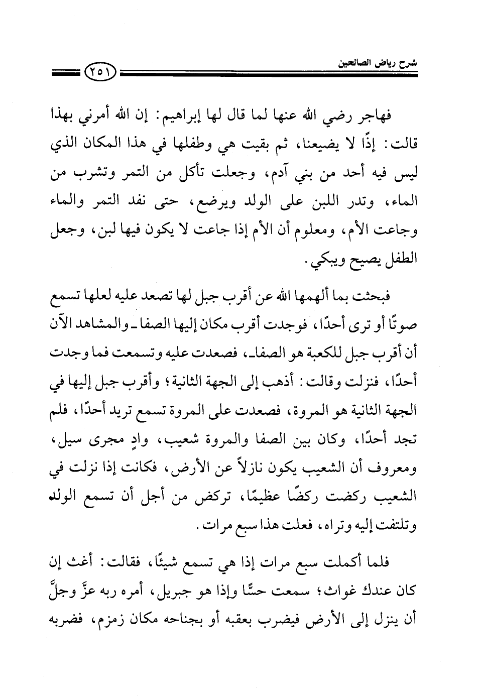 فهاجر رضى الله عنها لما قال لها إبراهيم: إن الله أمرني بهذا قالت إذا لا يضيعنا ثم بقيت هي وطفلها في هذا المكان الذي ليس فيه أحد من بني آدم وجعلت تأكل من التمر وتشرب من الماء وتدر اللبن على الولد ويرضع حتى نفذ التمر والماء وجاعت الأم ومعلوم أن الأم إذا جاعت لا يكون فيها لبن وجعل الطفل يصيح ويبكي فبحثت بما ألهمها الله عن أقرب جبل لها تصعد عليه لعلها تسمع صوتا أو ترى أحدا فوجد أقرب مكان إليها الصفا والمشاهد الآن أن أقرب جبل للكعبة هو الصفا فصعدت عليه وتسمعت فما وجدت أحدا فنزلت وقالت: أذهب إلى الجهة الثانية وأقرب جبل إليها في الجهة الثانية وهو المروة فصعدت على المروة تسمع فلم تجد أحدا وكان بين الصفا والمروة شعيب واد مجرى سيل ومعروف أن الشعيب يكون نازلا عن الأرض فكانت إذا نزلت في الشعيب ركضت ركضا عظيما تركض من أجل أن تسمع الولد وتلتفت إليه وتراه فعلت هذا سبع مرات فلما أكملت سبع مرات إذا هي تسمع شيئا فقالت أغث إن كان عندك غواث سمعت حسا وإذا هو جبريل أمره به عز وجل أن ينزل إلى الأرض فيضرب بعقبه أو بجناحه مكان زمزم فضربه