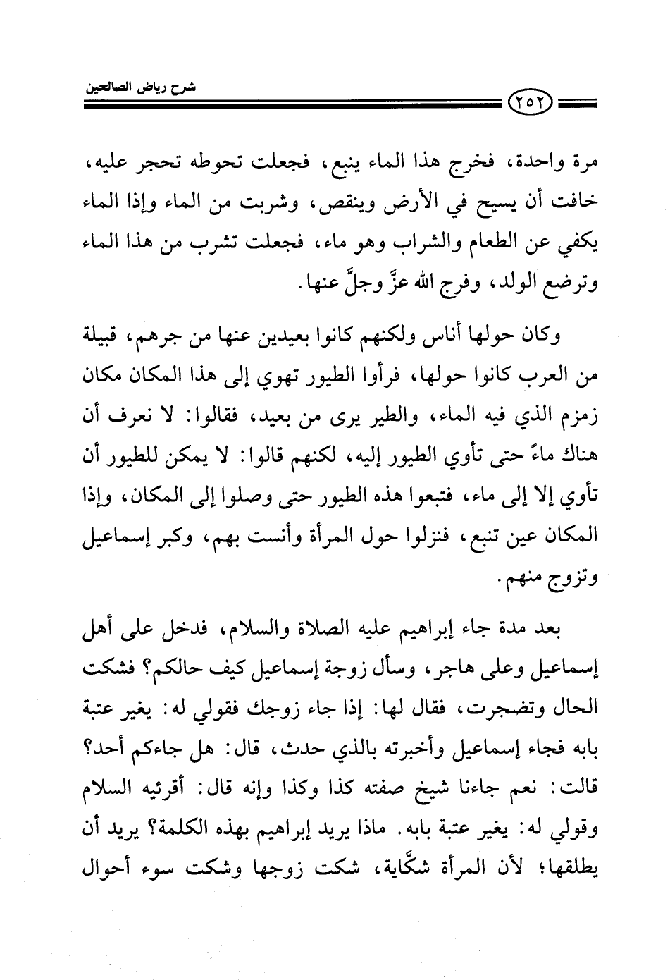 مرة واحدة فخرج هذا الماء ينبع فجعلت تحوطه تحجر عليه خافت أن يسيح في الأرض وينقص وشربت من الماء وإذا الماء يكفي عن الطعام والشراب وهو ماء فجعلت تشرب من هذا الماء وترضع الولد وفرج الله عز وجل عنها وكان حولها أناس ولكنهم كانوا بعيدين عنها من جرهم قبيلة من العرب كانوا حولها فرأوا الطيور تهوى إلى هذا المكان مكان زمزم الذي فيه الماء والطير يري من بعيد فقالوا ما خبرنا أن هنا ماء حتى تأوي الطيور إليه لكنهم قالوا لا يمكن للطيور أن تأوي إلا إلى الماء فتبعوا هذه الطيور حتى وصلوا إلى المكان وإذا المكان عين تنبع فنزلوا حول المرأة وأنست بهم وكبر إسماعيل وتزوج منهم بعد مدة جاء إبراهيم عليه الصلاة والسلام فدخل على أهل إسماعيل وعلى هاجر وسأل زوجة إسماعيل كيف حالكم؟ فشكت الحال وتضجرت فقال لها إذا جاء زوجك فقولي له يغير عتبة بابه فجاء إسماعيل وأخبرته الذي حصل قال: هل جاءكم أحد؟ قالت: نعم جاء شيخ صفته كذا وكذا وإنه قال: أقريئه السلام وقولي له يغير عتبة بابه ماذا يريد إبراهيم بهذه الكلمة؟ يريد أن يطلقها لأن المرأة شكاية شكت زوجها يعني أن ما عندهم إلا كل بؤس