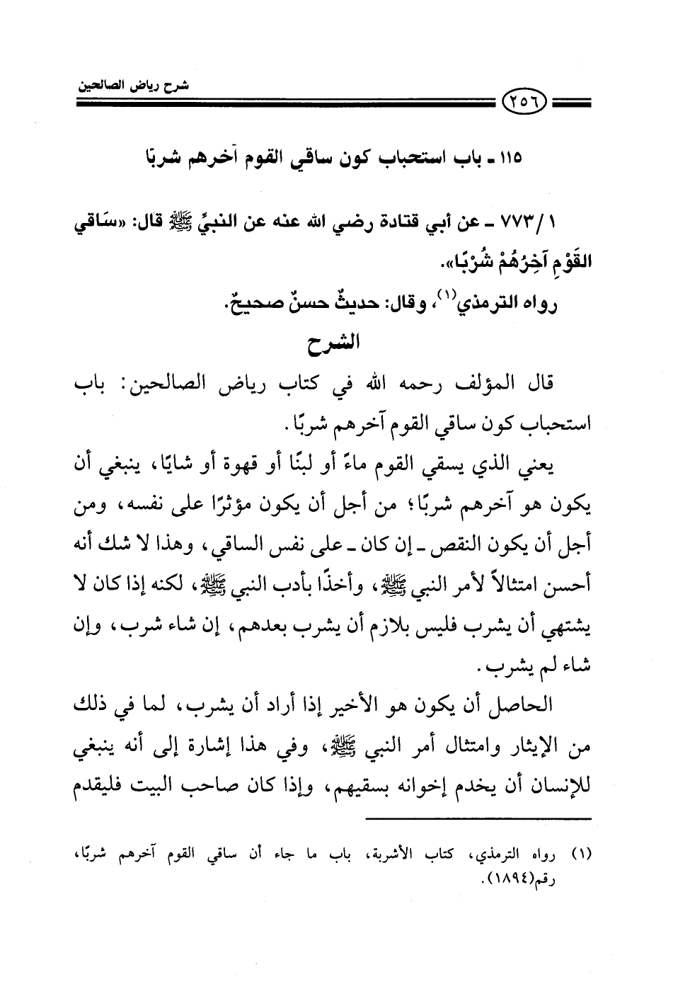 773 - عن أبي قتادة رضى الله عنه عن النبي صلى الله عليه وسلم قال: ساقي القوم آخرهم شربا رواه الترمذي وقال حديث حسن صحيح