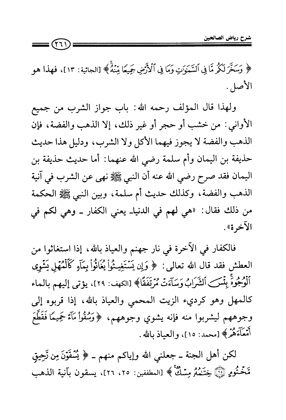 {وسخر لكم ما في السموات وما في الأرض جميعا منه} فهذا هو الأصل ولهذا قال المؤلف رحمه الله: (باب جواز الشرب من جميع الآنية) من خشب أو حجر أو غير ذلك إلا الذهب والفضة فإن الذهب والفضة لايجوز فيهما الأكل ولا الشرب ودليل هذا حديث حذيفة بن اليمان وأم سلمة رضى الله عنها أما حديث حذيفة بن اليمان فقد صرح رضى الله عنه أن النبي صلى الله عليه وعلى آله وسلم نهي عن الشرب في آنية الذهب والفضة وكذلك حديث أم سلمة وبين النبي صلى الله عليه وآله وسلم الحكمة من ذلك فقال: هي لهم في الدنيا يعني الكفار وهي لكم في الآخرة فالكفار في الآخرة في نار جهنم والعياذ بالله إذا استغاثوا وهلكوا من العطش فقد قال الله تعالى: {وَإِن يَسْتَغِيثُوا يُغَاثُوا بِمَاءٍ كَالْمُهْلِ يَشْوِي الْوجُوهَ بِئْسَ الشَّرَابُ وَسَاءَتْ مُرْتَفَقًا} يؤتي إليهم بالماء كالمهل وهو كرديء الزيت المحمي والعياذ بالله إذا قربوه إلى وجوههم ليشربوا منه فإنه يشوي وجوههم {وَسُقُوا مَاءً حَمِيمًا فَقَطَّعَ أَمْعَاءَهُمْ} والعياذ بالله لكن أهل الجنة جعلنا الله منهم {يُسْقَوْنَ مِن رَّحِيقٍ مَّخْتُومٍ خِتَامُهُ مِسْكٌ وَفِي ذَلِكَ فَلْيَتَنَافَسِ الْمُتَنَافِسُونَ} يسقون بآنية الذهب