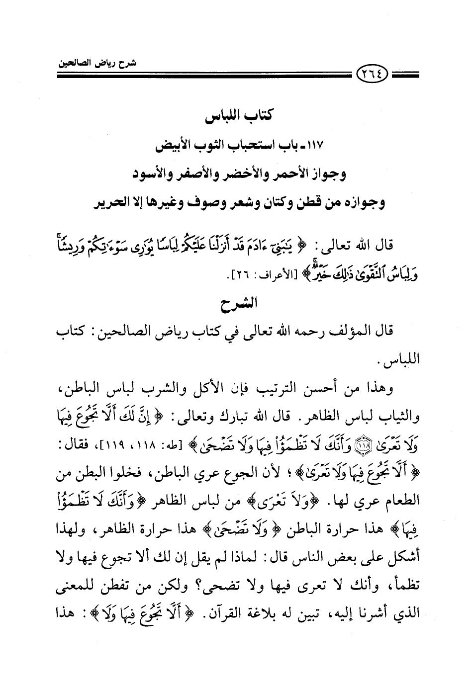 EXقال المؤلف رحمه الله: (كتاب اللباس) وهذا من أحسن الترتيب فإن الأكل والشرب لباس الباطن والثياب لباس الظاهر قال الله تبارك وتعالى: إِنَّ لَكَ أَلاَّ تَجُوعَ فِيهَا وَلاَ تَعْرَى وَأَنَّكَ لاَ تَظْمَأُ فِيهَا وَلاَ تَضْحَى فقال: {ألا تجوع فيها ولا تعرى} لأن الجوع عرى الباطن فخلو البطن من الطعام عري لها {ولا تعرى} من لباس الظاهر {وأنك لا تظمأ فيها} هذا حرارة الباطن {ولا تضحي} هذا حرارة الظاهر، ولهذا أشكل على بعض الناس قال: لماذا لم يقل إن لك ألا تجوع فيها ولا تظمأ وأنك لا تعرى فيها ولا تضحي؟ ولكن من تفطن للمعنى الذي أشرنا إليه تبين له بلاغة القرآن {ألا تجوع فيها} هذا