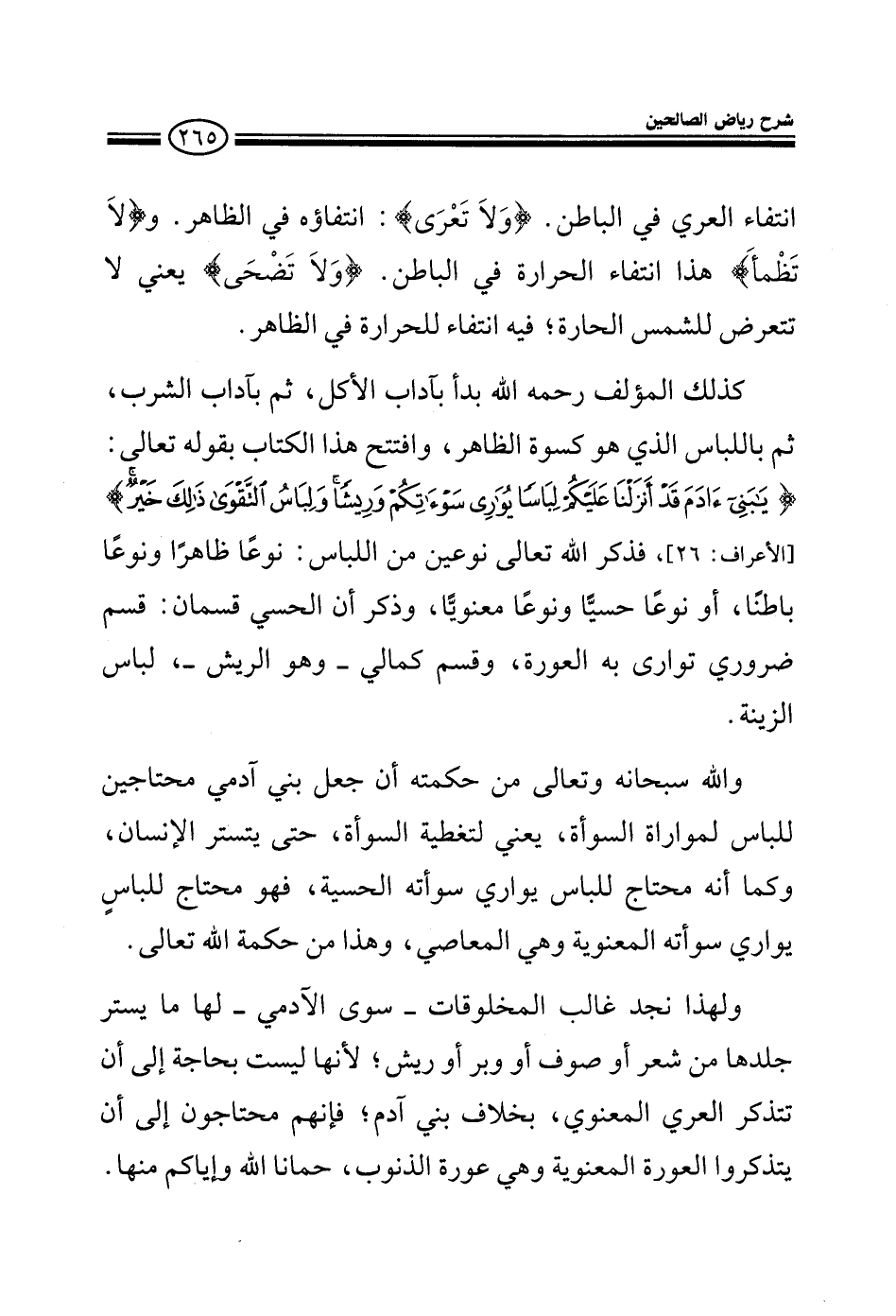 انتفاء العري في الباطن {ولا تعرى} انتفاؤه في الظاهر {لا تظمأ} هذا انتفاء الحرارة في الباطن {ولا تضحي} يعني لا تتعرض للشمس الحارة فيه انتفاء للحرارة في الظاهر كذلك المؤلف رحمه الله بدأ بآداب الأكل ثم بآداب الشرب ثم اللباس الذي هو كسوة الظاهر وافتتح هذا الكتاب بقوله تعالى: {يَا بَنِي آدَمَ قَدْ أَنْزَلْنَا عَلَيْكُمْ لِبَاسًا يُّوَارِي سَوْءَاتِكُمْ وَرِيشًا وَلِبَاسُ التَّقْوَى ذَلِكَ خَيْرٌ} فذكر الله تعالى نوعين من اللباس: نوعا ظاهرا ونوعا باطنا أو نوعا حسيا ونوعا معنويا وذكر أن الحسي قسمان: قسم ضروري تواري به العورة، وقسم كمالي وهو الريش لباس الزينة والله سبحانه وتعالى من حكمته أن جعل بني آدم محتاجين للباس لمواراة السوءة يعني لتغطية السوءة حتى يتستر الإنسان وكما أنه محتاج للباس يواري سوءته الحسية فهو محتاج للباس يواري سوءته المعنوية وهي المعاصي وهذا من حكمة الله تعالى ولهذا نجد غالب المخلوقات سوي الآدمي لها ما يستر جلدها من شعر أو صوف أو وبر أو ريش لأنها ليست بحاجة إلى أن تتذكر العري المعنوي بخلاف بني آدم فإنهم محتاجون إلي أن يتذكروا العورة المعنوية وهي عورة الذنوب حمانا الله منها