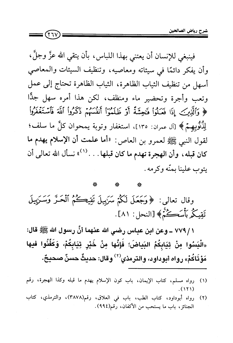 779 - وعن ابن عباس رضى الله عنهما أن رسول الله صلى الله عليه وسلم قال: البسوا من ثيابكم البياض فإنها من خير ثيابكم وكفنوا فيها موتاكم رواه أبو داود والترمذي وقال حديث حسن صحيح