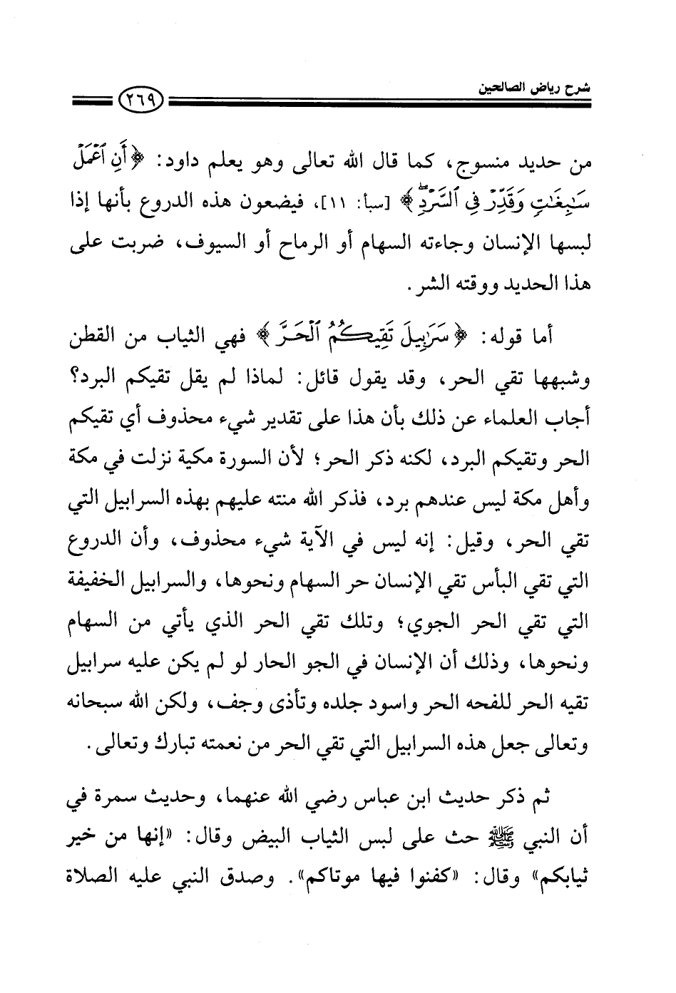 من حديد منسوج كما قال الله تعالى وهو يعلم داود: {أَنِ اعْمَلْ سَابِغَاتٍ وَقَدِّرْ فِي السَّرْدِ} فيصفون هذه الدروع بأنها إذا لبسها الإنسان وجاءته السهام أو الرماح أو السيوف ضربت على هذا الحديث ورقته الشر أما قوله: {سرابيل تقيكم الحر} فهي الثياب من القطن وشبهها تقي الحر وقد يقول قائل: لماذا لم يقل تقيكم البرد؟ أجاب العلماء عن ذلك بأن هذا على تقدير شيء محذوف أي تقيكم الحر وتقيكم البرد لكنه ذكر الحر لأن السورة مكية نزلت في مكة وأهل مكة ليس عندهم برد فذكر الله منته عليهم بهذه السرابيل التي تقي الحر وقيل: إنه ليس في الآية شيء محذوف وأن الدروع التي تقي البأس تقي الإنسان حر السهام ونحوها والسرابيل الخفيفة تقي الحر الجوي وذلك أن الإنسان في الجو الحار لو لم يكن عليه سرابيل تقيه الحر للفحه الحر واسود جلده وتأذي وجف ولكن الله سبحانه وتعالى جعل السرابيل التي تقي الحر من نعمته تبارك وتعالى ثم ذكر حديث ابن عباس رضى الله عنهما وحديث سمرة في أن النبي صلى الله عليه وسلم حث على لبس الثياب البيض وقال إنها من خير ثيابكم وقال: كفنوا فيها موتاكم وصدق النبي عليه الصلاة