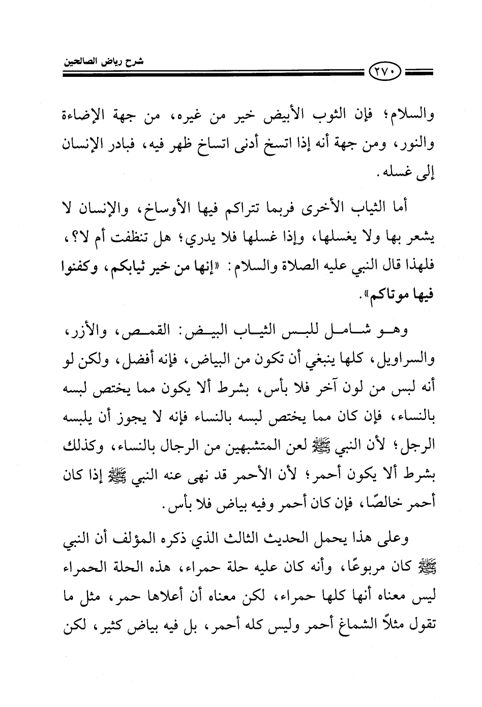 والسلام فإن الثوب الأبيض خير من غيره من جهة الإضاءة والنور ومن جهة أنه إذا اتساخ أدنى اتساخ ظهر فيه فبادر الإنسان إلى غسله أما الثياب الأخرى فربما تتراكم فيها الأوساخ والإنسان لا يشعر بها ولا يغسلها وإذا غسلها فلا يدري هل تنظف أم لا؟ فلهذا قال النبي عليه الصلاة والسلام إنها من خير ثيابكم وكفنوا فيها موتاكم وهو شامل للبس الثياب البيض القمص والأزر والسراويل كلها ينبغي أن تكون من البياض فإنه أفضل ولكن لو أنه لبس من لون آخر فلا بأس بشرط ألا يكون مما يختص لبسه بالنساء فإن كان مما يختص لبسه بالنساء فإنه لا يجوز أن يلبسه الرجل لأن النبي صلى الله عليه وعلى آله وسلم لعن المتشبهين من الرجال بالنساء وكذلك بشرط ألا يكون أحمر لأن الأحمر قد نهى عنه النبي صلى الله عليه وسلم إذا كان أحمر خالصا فإن كان أحمر وفيه أبيض فلا بأس وعلى هذا يحمل الحديث الثالث الذي ذكره المؤلف أن النبي صلى الله عليه وسلم كان مربوعا وأنه كان عليه حلة حمراء هذه الحلة الحمراء ليس معناها أنها كلها حمراء لكن معناها أن أعلامها حمر مثل ما تقول الشماغ أحمر وليس هو كله أحمر بل فيه بياض كثير لكن