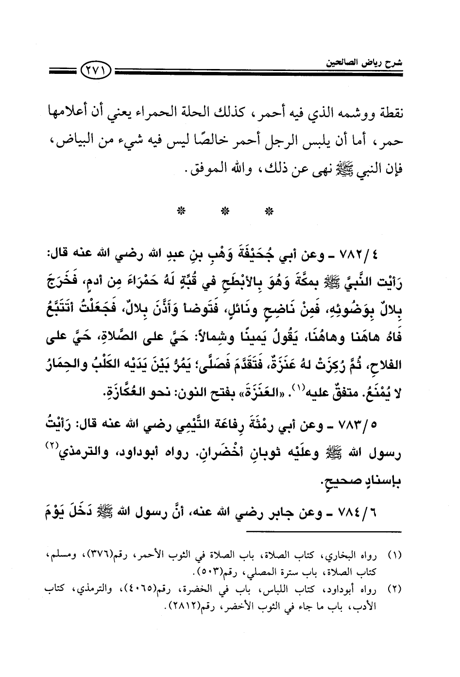 783 - وعن أبي رمثة رفاعة التيمي رضى الله عنه قال: رأيت رسول الله صلى الله عليه وسلم وعليه ثوبان أخضران رواه أبو داود والترمذي بإسناد صحيح