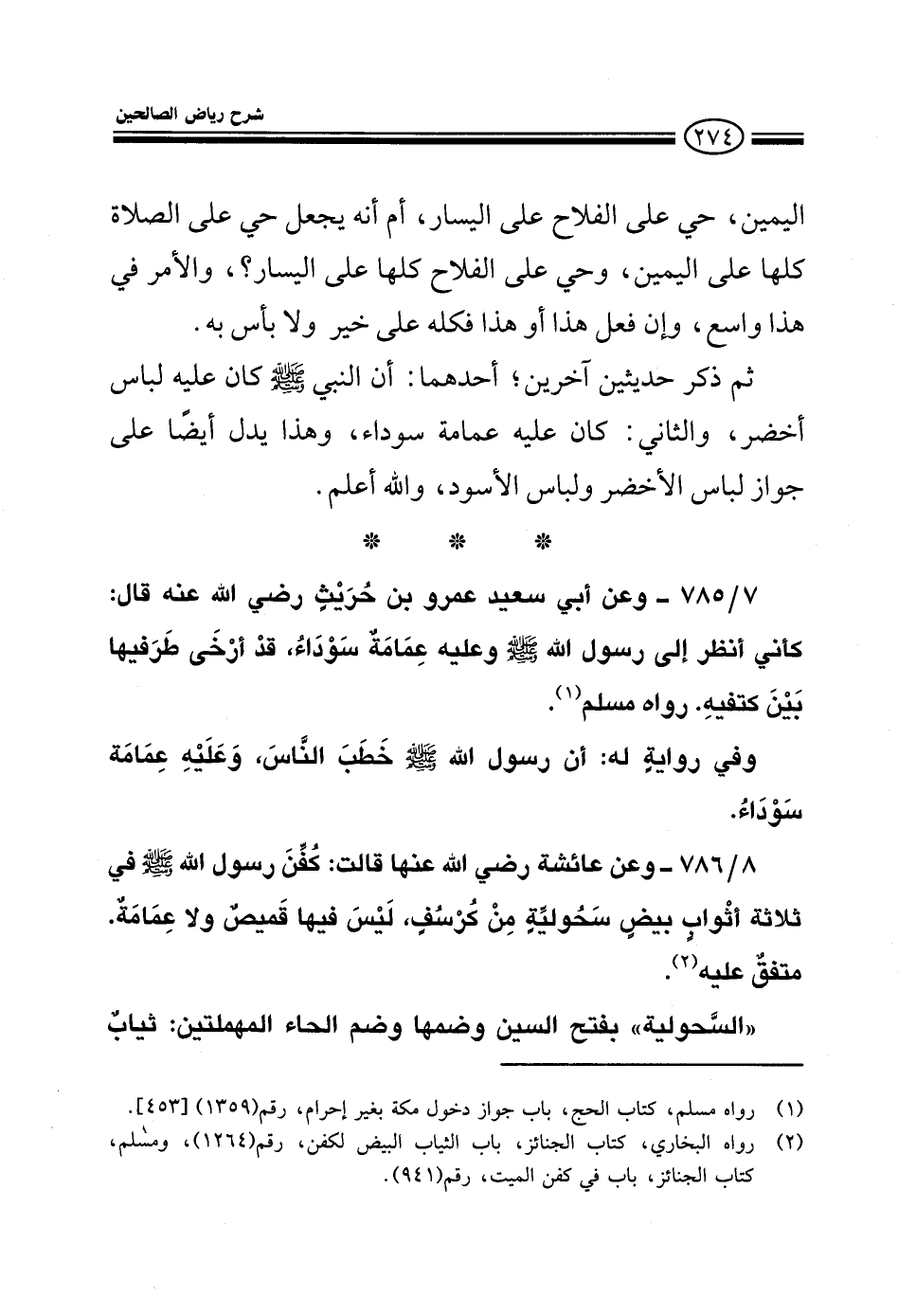 785 - وعن أبي سعيد عمرو بن حريث رضى الله عنه قال: كأني أنظر إلى رسول الله صلى الله عليه وسلم وعليه عمامة سوداء قد أرخى طرفيها بين كتفيه رواه مسلم وفي رواية له: أن رسول الله صلى الله عليه وسلم خطب الناس وعليه عمامة سوداء