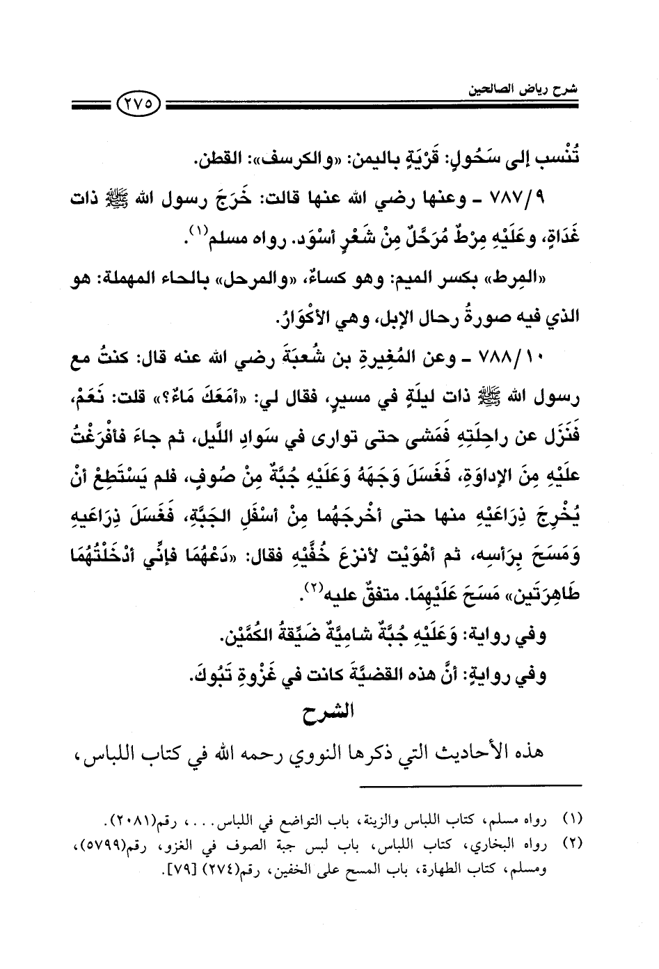 787 - وعنها قالت: خرج رسول الله صلى الله عليه وسلم ذات غداة وعليه مرط مرحل منه شعر أسود رواه مسلم المرط بكسر الميم: وهو كساء والمرحل بالحاء المهملة: هو الذي فيه صورة رحال الإبل، وهي الأكوار