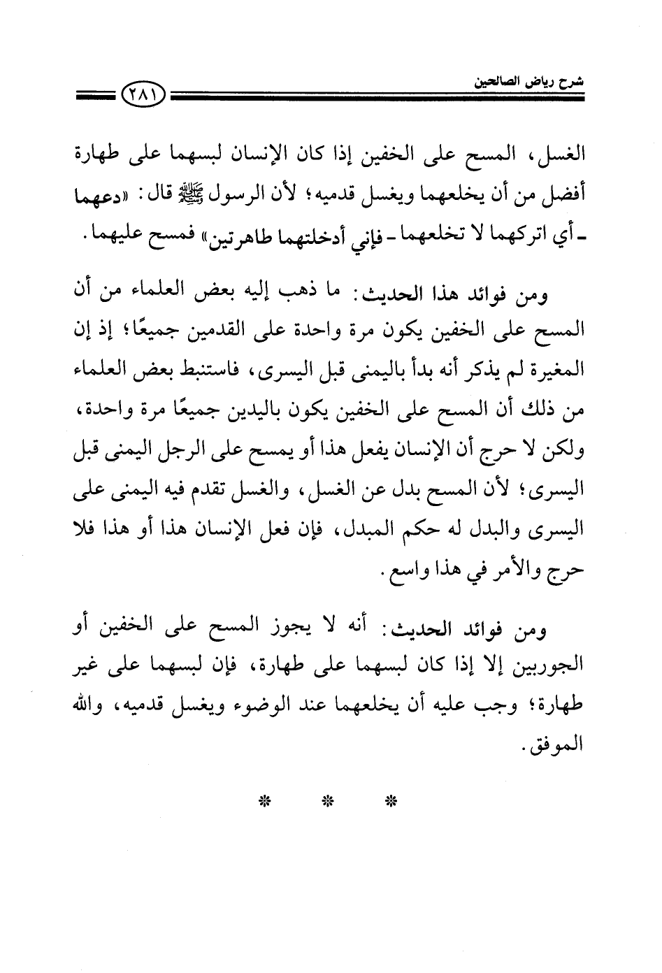 أن يخلعهما ويغسل قدميه لأن الرسول صلى الله عليه وسلم قال: دعهما أي اتركهما لا تخلعهما فإني أدخلتهما طاهرتين فمسح عليهما ومن فوائد هذا الحديث: ما ذهب إليه بعض العلماء من أن المسح على الخفين يكون مرة واحدة على القدمين إذ أن المغيرة لم يذكر أنه بدأ باليمني قبل اليسرى فاستنبط بعض العلماء من ذلك أن المسح على الخفين يكون باليدين جميعا مرة واحدة ولكن لا حرج أن الإنسان يفعل هذا أو يمسح على الرجل اليمنى قبل اليسرى لأن المسح بدل عن الغسل والغسل تقدم فيه اليمنى على اليسرى والبدل له حكم المبدل فإن فعل الإنسان هذا أو هذا فلا حرج والأمر في هذا واسع ومن فوائد الحديث: أنه لايجوز المسح على الخفين أو الجوربين إلا إذا كان لبسهما على طهارة فإن لبسهما على غير طهارة وجب عليه أن يخلعهما عند الوضوء ويغسل قدميه ومنه فوائد أخرى
