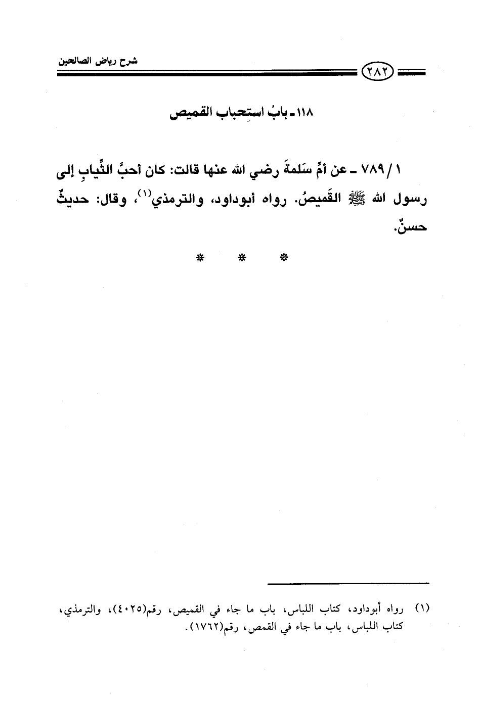 789 - عن أم سلمة رضى الله عنها قالت: كان أحب الثياب إلى رسول الله صلى الله عليه وسلم القميص رواه أبو داود والترمذي وقال: حديث حسن