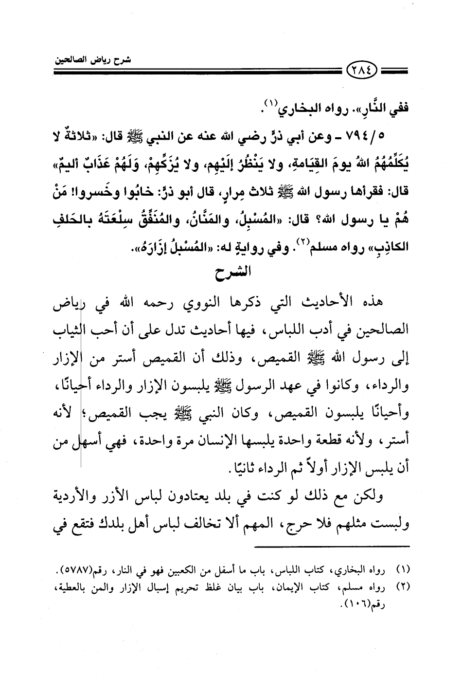 794 - وعن أبي ذر رضى الله عنه عن النبي صلى الله عليه وسلم قال: ثلاثة لا يكلمهم الله يوم القيامة ولا ينظر إليهم ولا يزكيهم ولهم عذاب أليم قال: فقرأها رسول الله صلى الله عليه وسلم ثلاث مرار قال أبو ذر: خابوا وخسروا من هم يا رسول الله؟ قال: المسبل والمنان والمنفق سلعته بالحلف الكاذب رواه مسلم وفي رواية له: المسبل إزاره