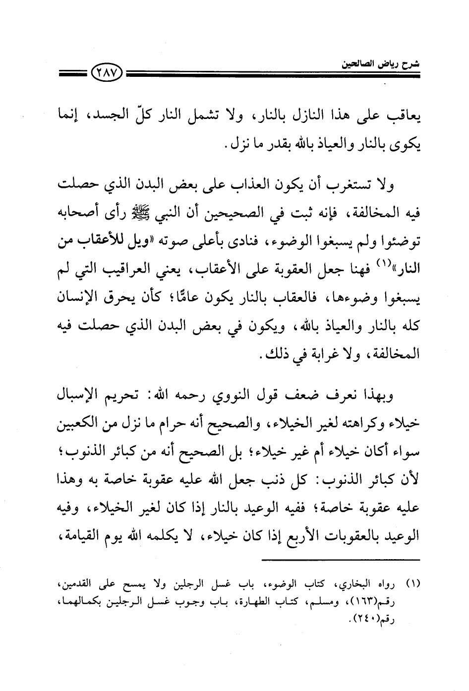 يعاقب على هذا النازل بالنار ولا يشمل النار كل الجسد إنما يكوي بالنار والعياذ بالله بقدر ما نزل ولا تستغرب أن يكون العذاب على بعض البدن الذي حصلت فيه المخالفة فإنه ثبت في الصحيحين أن النبي صلى الله عليه وسلم رأى أصحابه توضؤا ولم يسبغوا الوضوء فنادى بأعلى صوته ويل للأعقاب من النار فهنا جعل العقوبة على الأعقاب يعني العراقيب التي لم يسبغوا وضوءها فالعقاب بالنار يكون عاما كأن يحرق الإنسان كله بالنار والعياذ بالله ويكون في بعض البدن الذي حصلت فيه المخالفة ولا غرابة في ذلك وبهذا نعرف قول النووي رحمه الله بتحريم الإسبال خيلاء وكراهيته لغير الخيلاء والصحيح أنه حرام سواء أكان لخيلاء أم لغير خيلاء بل الصحيح أنه من كبائر الذنوب لأن كبائر الذنوب كل ذنب جعل الله عليه عقوبة خاصة به وهذا عليه عقوبة خاصة ففيه الوعيد بالنار إذا كان لغير الخيلاء وفيه وعيد بالعقوبات الأربع إذا كان خيلاء لا يكلمه الله يوم القيامة