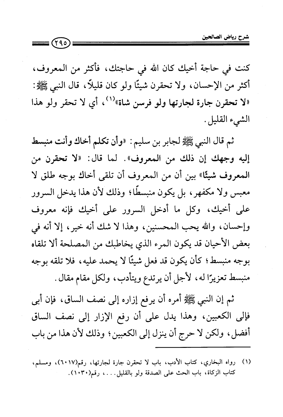 كنت في حاجة أخيك كان الله في حاجتك فأكثر من المعروف أكثر من الإحسان ولا تحقرن شيئا ولو كان قليلا قال النبي صلى الله عليه وسلم لا تحقرن جارة لجارتها ولو فرسن شاة أي لا تحقر ولو هذا الشيء القليل ثم قال النبي صلى الله عليه وسلم لجابر بن سليم: وأن تكلم أخاك وأنت منبسط إليه وجهك إن ذلك من المعروف لما قال: لا تحقرن من المعروف شيئا بين أن من المعروف أن تلقي أخاك بوجه طلق لا معبس ولا مكفهر بل يكون منبسطا وذلك لأن هذا يدخل السرور على أخيك وكل أدخل السرور على أخيك فإنه معروف وإحسان والله يحب المحسنين وهذا لا شك أنه خير إلا أنه في بعض الأحيان قد يكون المرء الذي يخاطبك من المصلحة ألا تلقاه بوجه منبسط كأن يكون قد فعل شيئا لا يحمد عليه فلا تلقه بوجه منبسط تعزيزا له لأجل أن يرتدع ويتأدب ولكل مقام مقال ثم إن النبي صلى الله عليه وسلم أمره أن يرفع إزاره إلي نصف الساق فإن أبي فإلى الكعبين وهذا يدل على أن رفع الإزار إلى نصف الساق أفضل ولكن لا حرج أن ينزل إلى الكعبين وذلك لأن هذا من باب