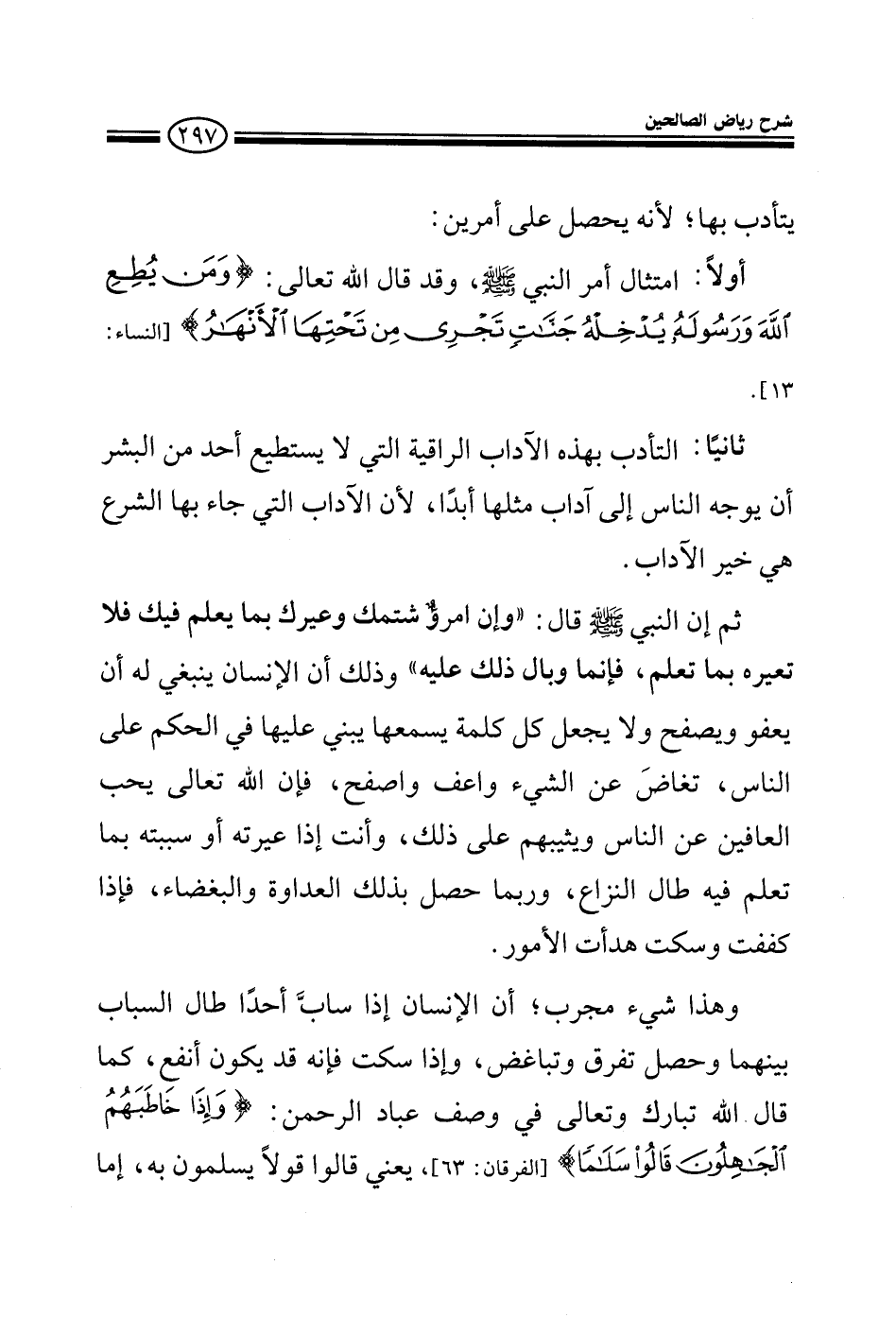 يتأدب بها لأنه يحصل على أمرين أولا: امتثال أمر النبي صلى الله عليه وسلم وقد قال الله تعالى: {ومن يطع الله ورسوله يدخله جنات تجري من تحتها الأنهار} ثانيا: التحلي بحسن الخلق من خلال التأدب بهذه الآداب الراقية التي لا يستطيع أحد من البشر أن يوجه الناس إلى آداب مثلها أبدا لأن الآداب التي جاء بها الشرع هي خير الآداب ثم إن النبي صلى الله عليه وعلى آله وسلم قال: وإن امرؤ شتمك وعيرك بما يعلم فيك فلا تعيره بما تعلم فإنما وبال ذلك عليه وذلك أن الإنسان ينبغي له أن يعفو ويصفح ولا يجعل كل كلمة يسمعها مقياسا له في الحكم على الناس تغاض عن الشيء واعف واصفح فإن الله تعالى يحب العافين عن الناس ويثيبهم على ذلك وأنت إذا عيرته أو سببته بما تعلم فيه طال النزاع وربما حصل بذلك العداوة والبغضاء فإذا كففت وسكت هدأت الأمور وهذا شيء مجرب أن الإنسان إذا ساب أحدا قد سبه طال السباب بينهما وحصل تفرق وتباغض وإذا سكت فإنه قد يكون أنفع كما قال الله تبارك وتعالى في وصف عباد الرحمن {وَإِذَا خَاطَبَهُمُ الْجَاهِلُونَ قَالُوا سَلاَمًا} يعني قالوا قولا يسلمون به إما