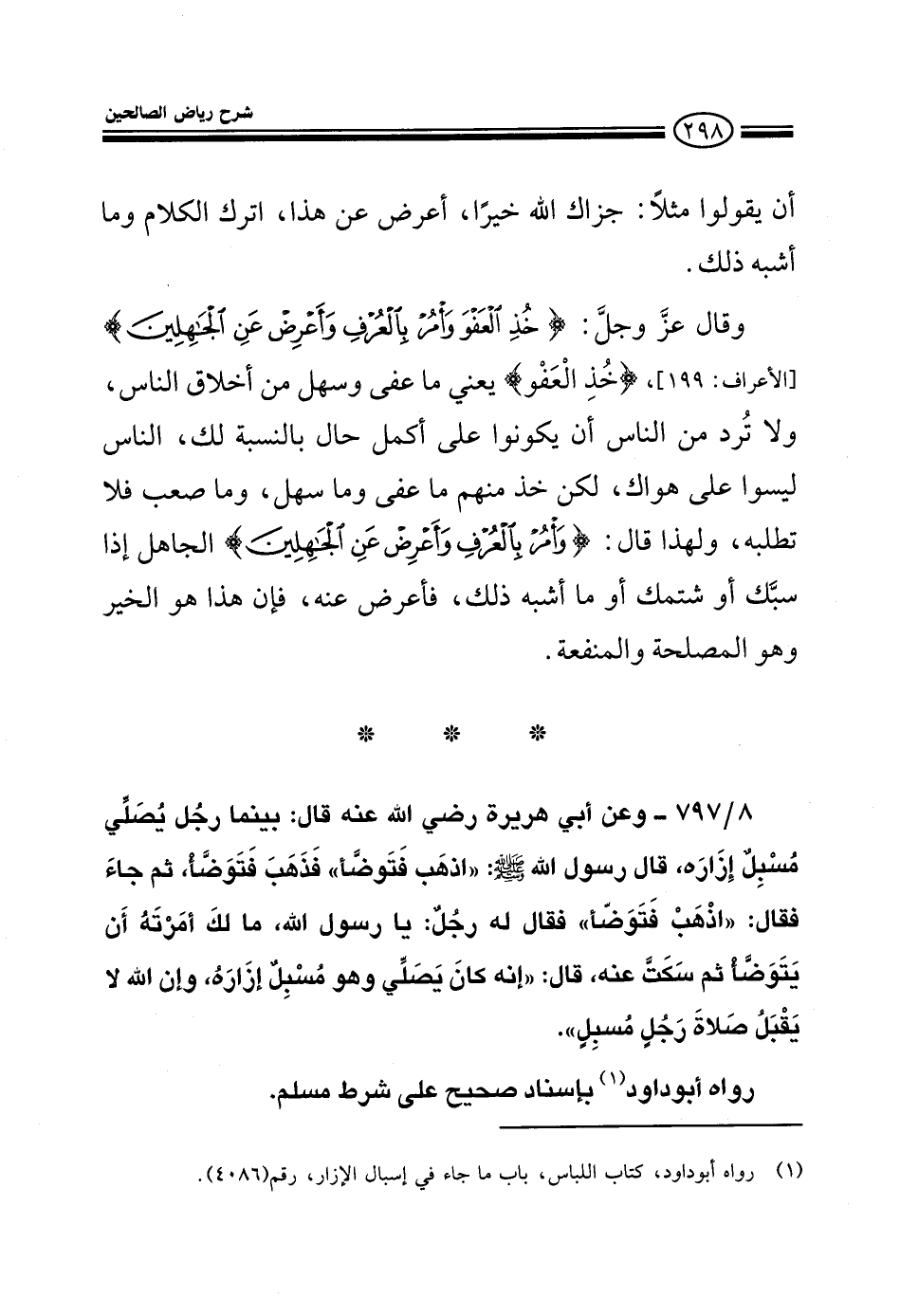 797 - وعن أبي هريرة رضي الله عنه قال: بينما رجل يصلي مسبل إزاره قال له رسول الله صلى الله عليه وسلم: اذهب فتوضأ فذهب وتوضأ ثم جاء، فقال اذهب وتوضأ فقال له رجل: يا رسول الله مالك أمرته أن يتوضأ ثم سكت عنه؟ قال: إنه كان يصلي وهو مسبل إزاره وإن الله لا يقبل صلاة رجل مسبل رواه أبو داود بإسناد صحيح على شرط مسلم