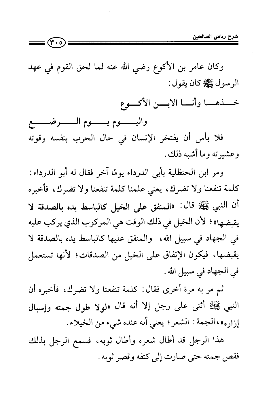 وكان عامر بن الأكوع رضي الله عنه لما لحق القوم في عهد الرسول عليه الصلاة والسلام كان يقول خذها وأنا ابن الأكوع واليوم يوم الرضع فلا بأس أن يفتخر الإنسان في حال الحرب بنفسه وقوته وعشيرته وما أشبه ذلك ومر ابن الحنظلية بأبي الدرداء يوما آخر فقال له أبو الدرداء: كلمة تنفعنا ولا تضرك يعني كلمة تنفعنا ولا تضرك فأخبره أن النبي صلى الله عليه وسلم قال: المنفق على الخيل كالباسط يده بالصدقة لا يقبضها لأن الخيل في ذلك الوقت هي المركوب الذي يركب به في الجهاد في سبيل الله والمنفق عليها كالباسط يده بالصدقة لا يقبضها فيكون الإنفاق على الخيل من الصدقات لأنها تستعمل في الجهاد في سبيل الله ثم مر به مرة آخرى فقال: كلمة تنفعنا ولا تضرك فأخبره أن النبي صلى الله عليه وعلى آله وسلم أثنى على رجل إلا أنه قال: لولا طول جمته وإسبال إزاره الجمة: الشعر يعني أنه عنده شيء من الخيلاء هذا الرجل قد أطال شعره وأطال ثوبه، فسمع الرجل بذلك فقص جمته حتى صارت إلى كتفه وقصر ثوبه