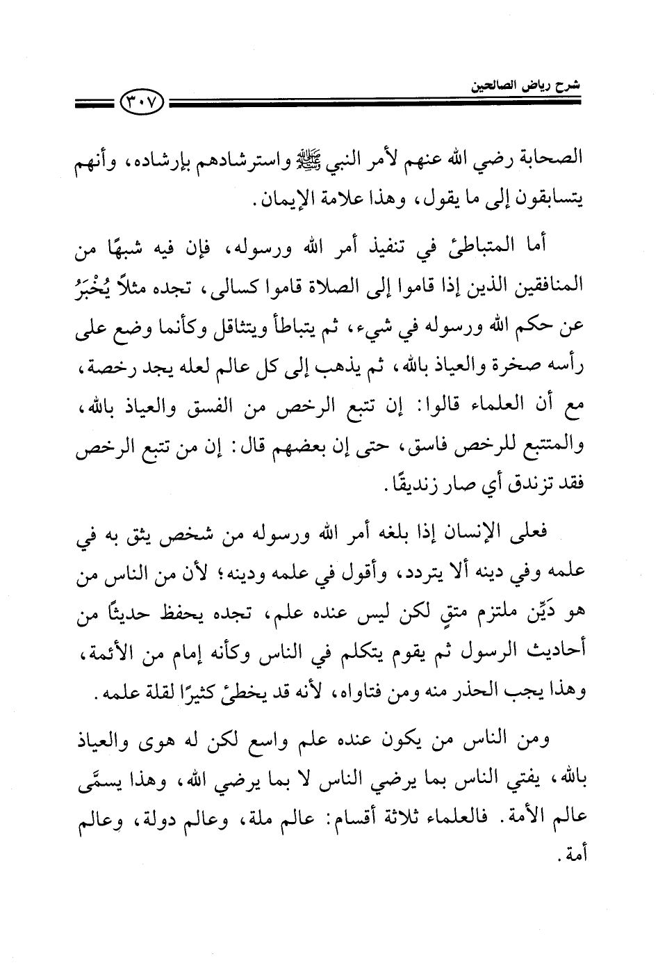 الصحابة رضي الله عنهم لأمر النبي صلى الله عليه وسلم واسترشادهم بإرشاده وأنهم كانوا يتسابقون إلي تنفيذ ما يقول وهذا علامة الإيمان أما المتباطئ في تنفيذ أمر الله ورسوله، فإن فيه شبها من المنافقين الذين إذا قاموا إلى الصلاة قاموا كسالى، تجده مثلا يخبر عن حكم الله ورسوله في شيء، ثم يتباطأ ويتثاقل وكأنما وضع رأسه صخرة والعياذ بالله ثم يذهب إلى كل عالم لعله يجد رخصة مع أن العلماء قالوا إن تتبع الرخص من الفسق والعياذ بالله والمتتبع للرخص فاسق حتى إن بعضهم قال: إن من تتبع الرخص فقد تزندق أي صار زنديقا فعلى الإنسان إذا بلغه أمر الله ورسوله من شخص يثق به في علمه وفي دينه ألا يتردد، وأقول في علمه ودينه لأن من الناس من هو دين ملتزم متق لكن ليس عنده علم، تجده يحفظ حديثا من أحاديث الرسول ثم يقوم يتكلم في الناس وكأنه إمام من الأئمة، وهذا يجب الحذر منه ومن فتاواه، لأنه قد يخطئ كثيرا لقلة علمه ومن الناس من يكون عنده علم واسع لكن له هوى والعياذ بالله، يفتي الناس بما يرضى الناس لا بما يرضي الله، وهذا يسمى عالم الأمة.