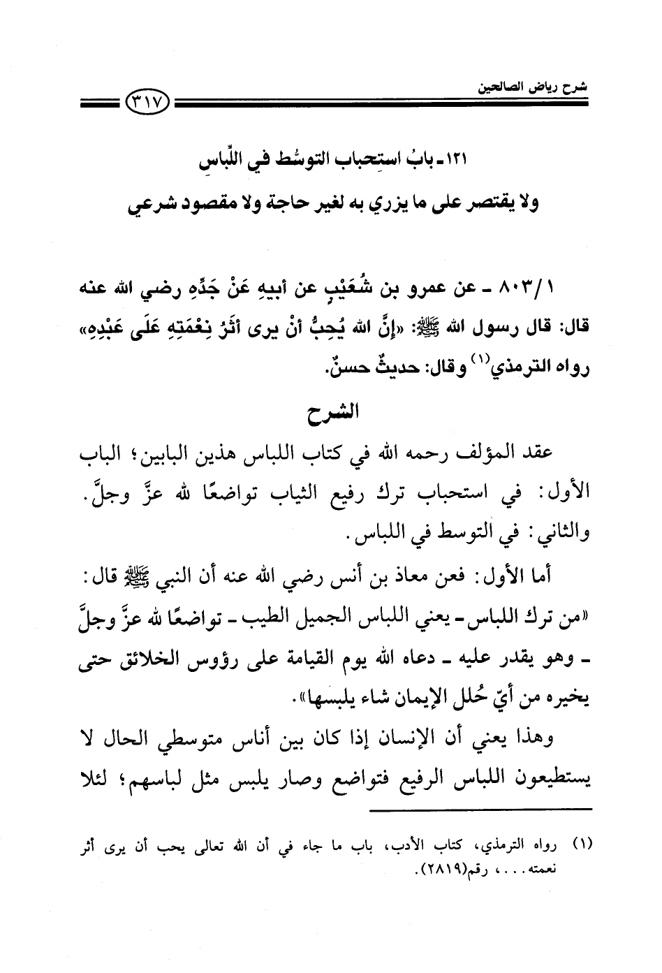 803 - عن عمرو بن شعيب عن أبيه عن جده رضي الله عنه قال: قال رسول الله صلى الله عليه وسلم: إن الله يحب أن يرى أثر نعمته على عبده رواه الترمذي وقال: حديث حسن