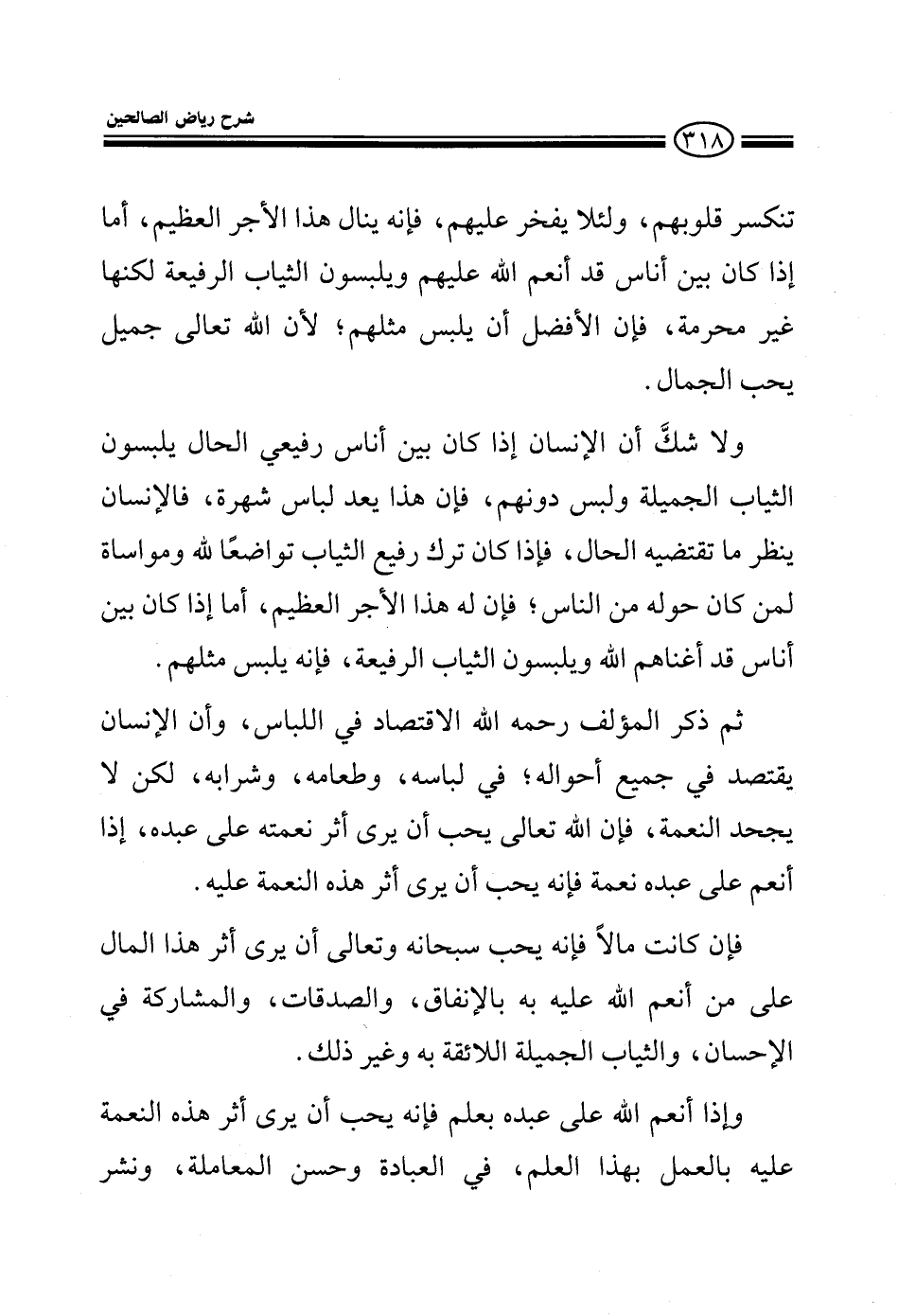 تنكسر قلوبهم، ولئلا يفخر عليهم، فإنه ينال هذا الأجر العظيم أما إذا كان بين أناس قد أنعم عليهم ويلبسون الثياب الرفيعة لكنها غير محرمة، فإن الأفضل أن يلبس مثلهم لأن الله تعالى جميل يحب الجمال ولاشك أن الإنسان إذا كان بين أناس رفيعي الحال يلبسون الثياب الجميلة ولبس دونهم فإن هذا يعد لباس شهرة فالإنسان ينظر ما تقتضيه الحال فإذا كان ترك رفيع الثياب تواضعا لله ومواساة لمن كان حوله من الناس فإن له هذا الأجر العظيم أما إذا كان بين أناس قد أغناهم الله ويلبسون الثياب الرفيعة فإنه يلبس مثلهم ثم ذكر المؤلف رحمه الله الاقتصاد في اللباس وأن الإنسان يقتصد في جميع أحواله في لباسه وطعامه وشرابه لكن لا يجحد النعمة فإن الله تعالى يحب أن يرى أثر نعمته على عبده إذا أنعم على عبده نعمة فإنه يحب أن يري أثر هذه النعمة عليه فإن كانت مالا فإنه يحب سبحانه وتعالى أن يرى أثر هذا المال على من أنعم الله عليه به بالإنفاق والصدقات والمشاركة في الإحسان والثياب الجميلة اللائقة به وغير ذلك وإذا أنعم الله على عبده بعلم فإنه يحب أن يرى أثر هذه النعمة عليه بالعمل بهذا العلم في العبادة وحسن المعاملة ونشر