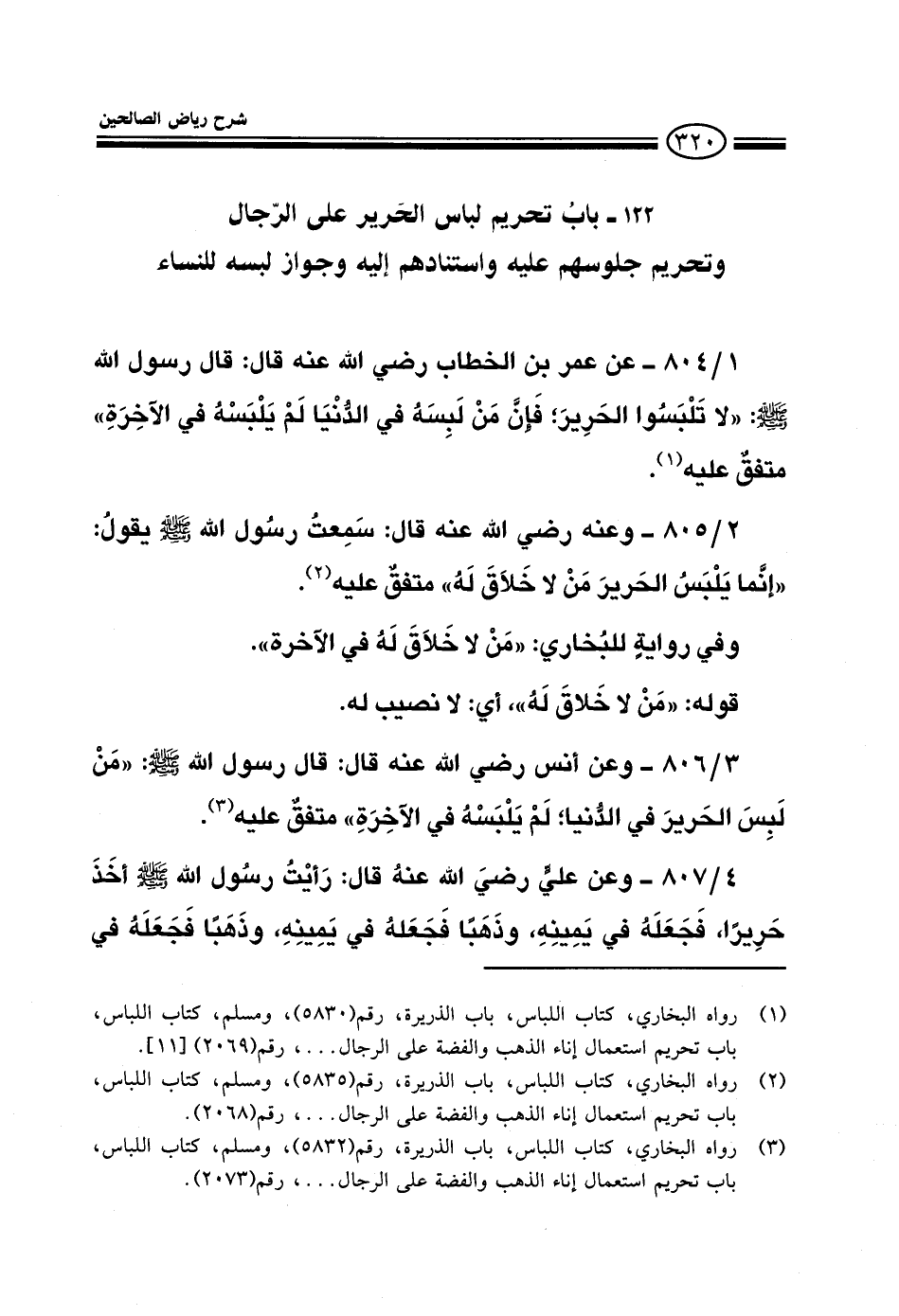 804 - عن عمر بن الخطاب رضي الله عنه قال: قال رسول الله صلى الله عليه وسلم: لا تلبسوا الحرير فإن من لبسه في الدنيا لم يلبسه في الآخرة متفق عليه