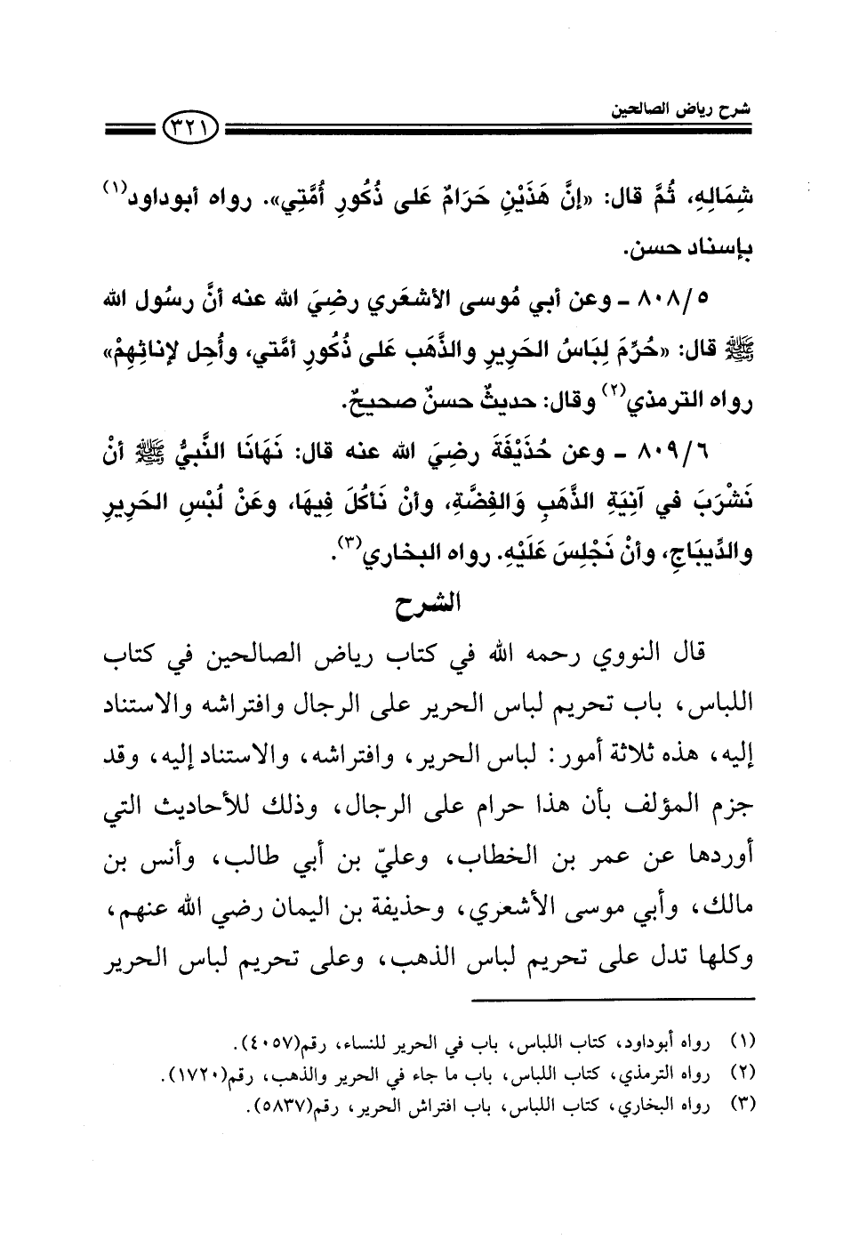 808 - وعن أبي موسى الأشعري رضي الله عنه أن رسول الله صلى الله عليه وسلم قال: حرم لباس الحرير والذهب على ذكور أمتي وأحل لإناثهم رواه الترمذي وقال حديث حسن صحيح