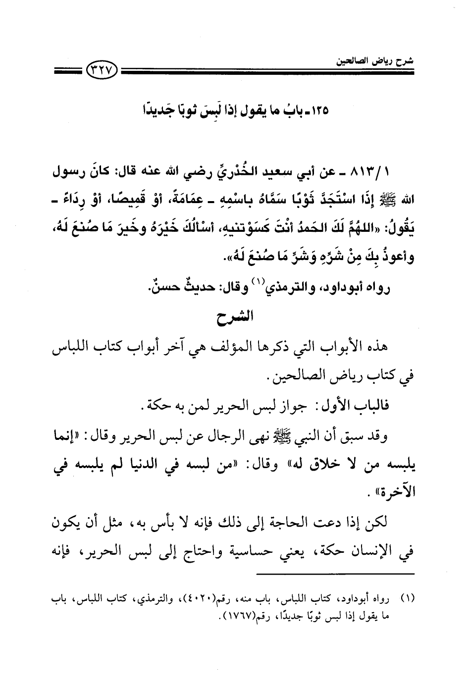813 - عن أبي سعيد الخدري رضي الله عنه قال: كان رسول الله صلى الله عليه وسلم: إذا استجد ثوبا سماه عمامة أو قميصا أو رداء يقول: اللهم لك الحمد أنت كسوتنيه أسألك خيره وخير ما صنع له وأعوذ بك من شره وشر ما صنع له رواه أبو داود، والترمذي وقال: حديث حسن