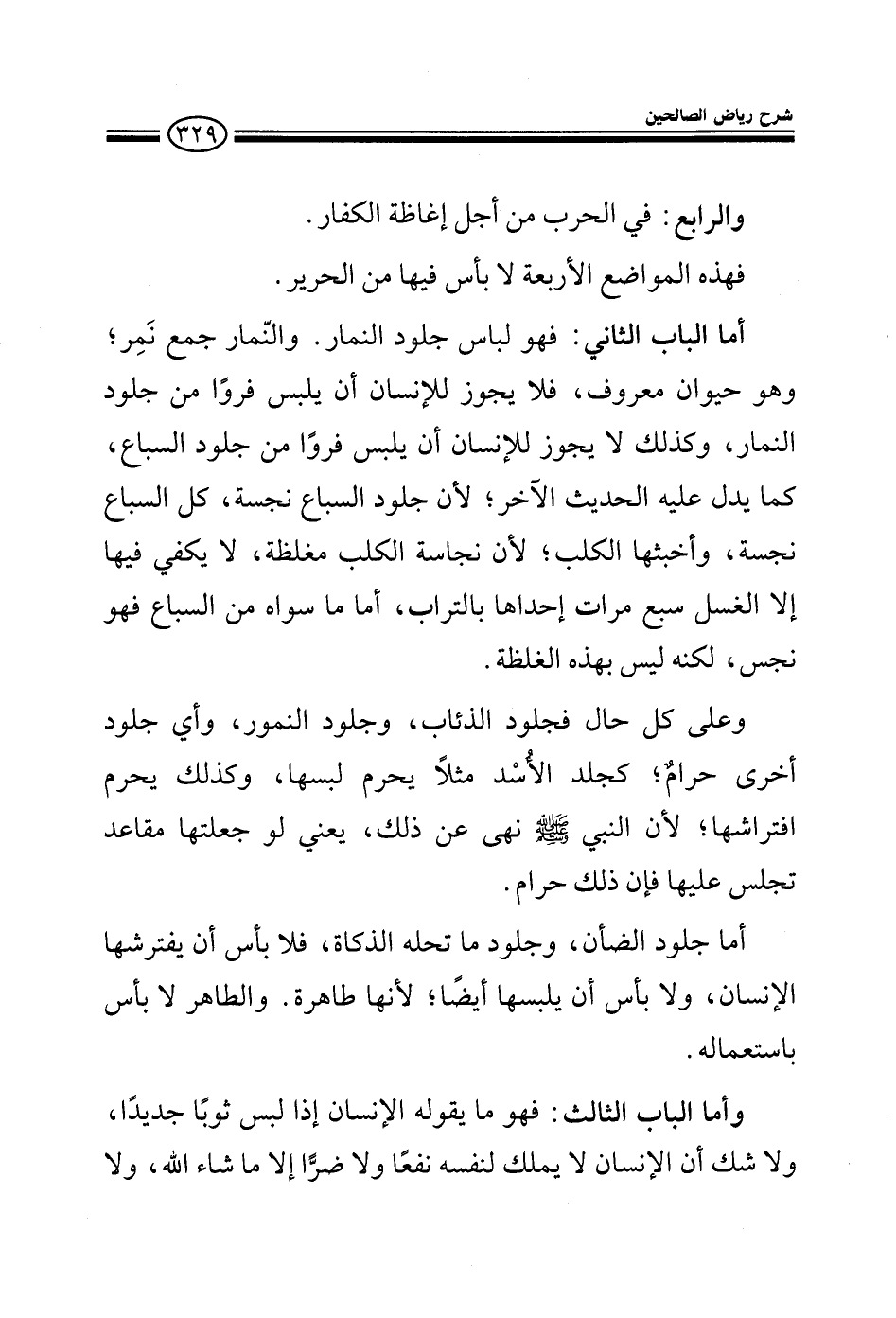 والرابع: في الحرب من أجل إغاظة الكفار فهذه المواضع الأربعة لا بأس فيها من الحرير أما الباب الثاني: فهو لباس جلود النمار والنمار جمع نمر وهو حيوان معروف فلا يجوز للإنسان أن يلبس فروا من جلود النمار وكذلك لا يجوز الإنسان أن يلبس فروا من جلود السباع كما يدل عليه الحديث الآخر لأن جلود السباع نجسة كل السباع نجسة وأخبثها الكلب لأن نجاسة الكلب مغلظة لا يكفي فيها إلا الغسل سبع مرات إحداها بالتراب أما ما سواه من السباع فهو نجس، لكن ليس بهذه الغلظة وعلى كل حال فجلود الذئاب وجلود النمور وأي جلود أخرى حرام كجلد الأسد مثلا يحرم لبسها وكذلك ويحرم افتراشها لأن النبي صلى الله عليه وعلى آله وسلم نهي عن ذلك يعنى لو جعلتها مقاعد تجلس عليها فإن ذلك حرام أما جلود الضأن وجلود ما تحله الزكاة، فلا بأس أن يفترشها الإنسان ولا بأس أن يلبسها أيضا لأنها طاهرة والطاهر لا بأس باستعماله.