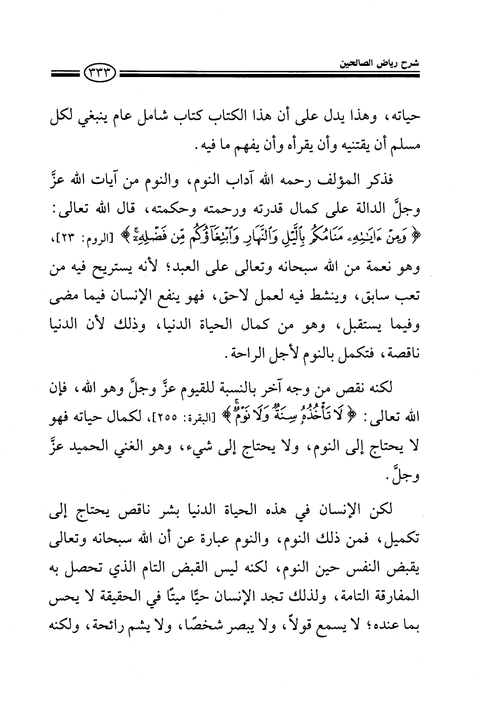 حياته وهذا يدل على أن هذا الكتاب أعني رياض الصالحين كتاب شامل عام ينبغي لكل مسلم أن يقتنيه وأن يقرأه وأن يفهم ما فيه فذكر المؤلف رحمه الله آداب النوم والنوم من آيات الله عز وجل الدالة على كمال قدرته وحكمته قال تعالى: وَمِنْ آيَاتِهِ مَنَامُكُم بِاللَّيْلِ وَالنَّهَارِ وَابْتِغَاؤُكُم مِّن فَضْلِهِ وهو نعمة من الله تعالى على العبد لأنه يستريح فيه من تعب سابق وينشط فيه لعمل لاحق فهو ينفع الإنسان فيما مضى وفيما يستقبل وهو من كمال الحياة الدنيا وذلك لأن الدنيا ناقصة فتكمل بالنوم لأجل الراحة لكنه نقص من وجه آخر بالنسبة للقيوم عز وجل وهو الله فإن الله تعالى: {لا تأخذه سنة ولا نوم} لكمال حياته فهو لا يحتاج إلى النوم ولا يحتاج إلى شيء وهو الغني الحميد عز وجل لكن الإنسان في هذه الحياة الدنيا بشر ناقص يحتاج إلى تكميل والنوم عبارة عن أن الله سبحانه وتعالى يقبض النفس حين النوم لكنه ليس القبض التام الذي تحصل به المفارقة التامة ولذلك تجد الإنسان حيا ميتا في الحقيقة لا يحس بما عنده لا يسمع قولا ولا يبصر شخصا ولا يشم رائحة ولكن