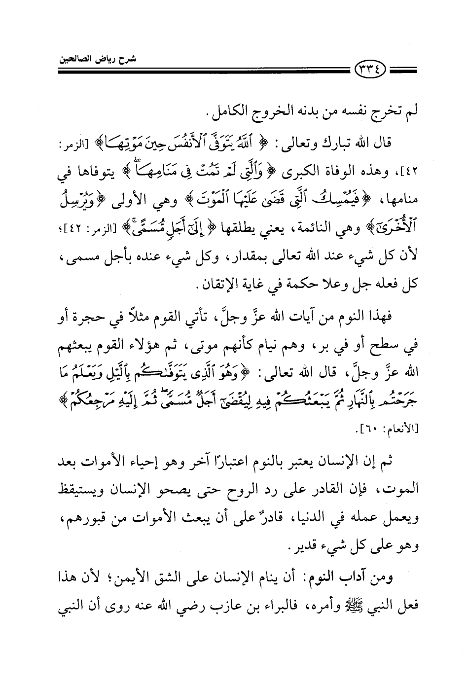 لم تخرج نفسه من بدنه الخروج الكامل قال الله تعالى: {اللهُ يَتَوَفَّى الأَنْفُسَ حِينَ مَوْتِهَا} وهذه الوفاة الكبرى: {والتي لم تمت في منامها} يتوفاها في منامها {فيمسك التي قضى عليها الموت} وهي الأولى {ويرسل الآخرى} وهي النائمة يعني يطلقها {إلى أجل مسمى} لأن كل شيء عند الله تعالى وبمقدار وكل شيء عنده بأجل مسمى كل فعله جل وعلا حكمة في غاية الإتقان فهذا النوم من آيات الله عز وجل تأتي القوم مثلا في حجرة أو في سطح أو في بر وهم نيام كأنهم جثث موتى لا يشعرون بشيء ثم هؤلاء القوم يبعثهم الله عز وجل قال الله تعالى: {وَهُوَ الَّذِي يَتَوَفَّاكُم بِاللَّيْلِ وَيَعْلَمُ مَا جَرَحْتُم بِالنَّهَارِ ثُمَّ يَبْعَثُكُمْ فِيهِ لِيُقْضَى أَجَلٌ مُّسَمًّى ثُمَّ إِلَيْهِ مَرْجِعُكُمْ} ثم إن الإنسان يعتبر بالنوم اعتبارا آخر وهو إحياء الأموات بعد الموت فإن القادر على رد الروح حتى يصحو الإنسان ويستيقظ ويعمل عمله في الدنيا قادر على أن يبعث الأموات من قبورهم وهو على كل شيء قدير ومن آداب النوم: أن ينام الإنسان على الشق الأيمن لأن هذا فعل النبي صلى الله عليه وسلم وأمره فالبراء بن عازب رضي الله عنه روى أن النبي